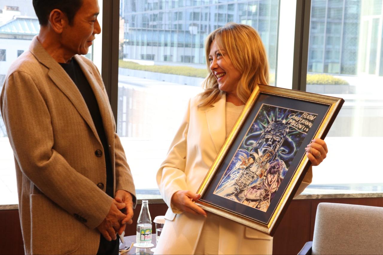 意大利总理梅洛尼访日会见《北斗神拳》作者原哲夫 获赠签名版画 意大利总理乔治娅·梅洛尼(Giorgia Meloni)在访日期间实现了一场特殊的“粉丝会面”。她与漫画巨匠、《北斗之拳》作者原哲夫先生在东京亲切会晤。作为《北斗之拳》的忠实拥趸,梅洛尼总理收到了原哲夫特意准备的签名纪念版画作为生日礼物。两人随后愉快合影,画面中梅洛尼笑容满面,原哲夫则竖起大拇指致意。梅洛尼事后在个人Instagram上分享了这份特别的纪念,并配文表达激动之情。