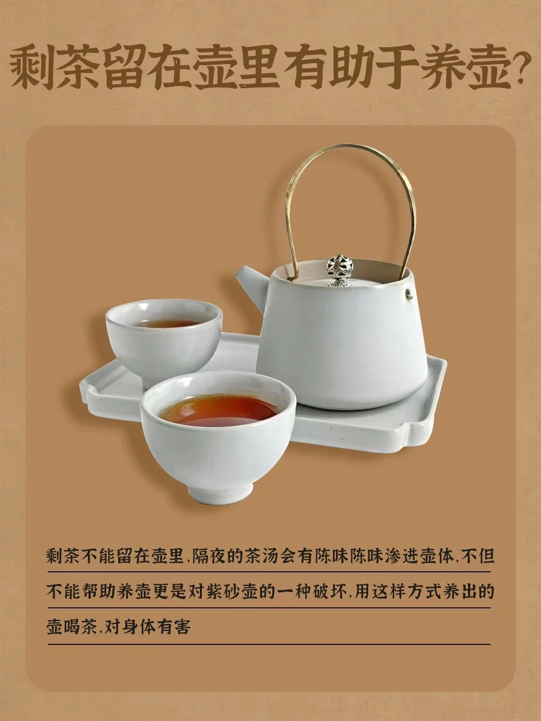 剩茶不能留在壶里,隔夜的茶汤会有陈味陈味渗进壶体,不但不能帮助养壶更是对紫砂壶的一种破坏
