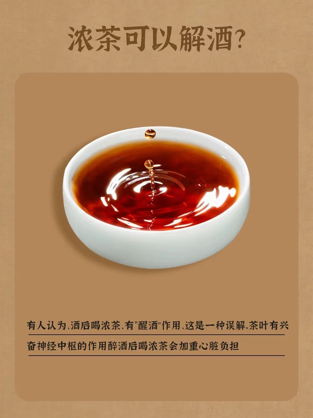 酒后喝浓茶,有“醒酒"作用,这是一种误解。茶叶有兴奋神经中枢的作用醉酒后喝浓茶会加重心脏负担