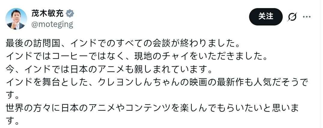 日本外务大臣茂木敏充:我在印度(我此次访问的最后一国)的所有会议现已结束。 在印度,我喝的是当地的奶茶,而不是咖啡。 日本动漫现在在印度很受欢迎。 最新一部以印度为背景的蜡笔小新电影据说也很受欢迎。 我希望世界各地的人们都能欣赏日本动漫和相关内容。