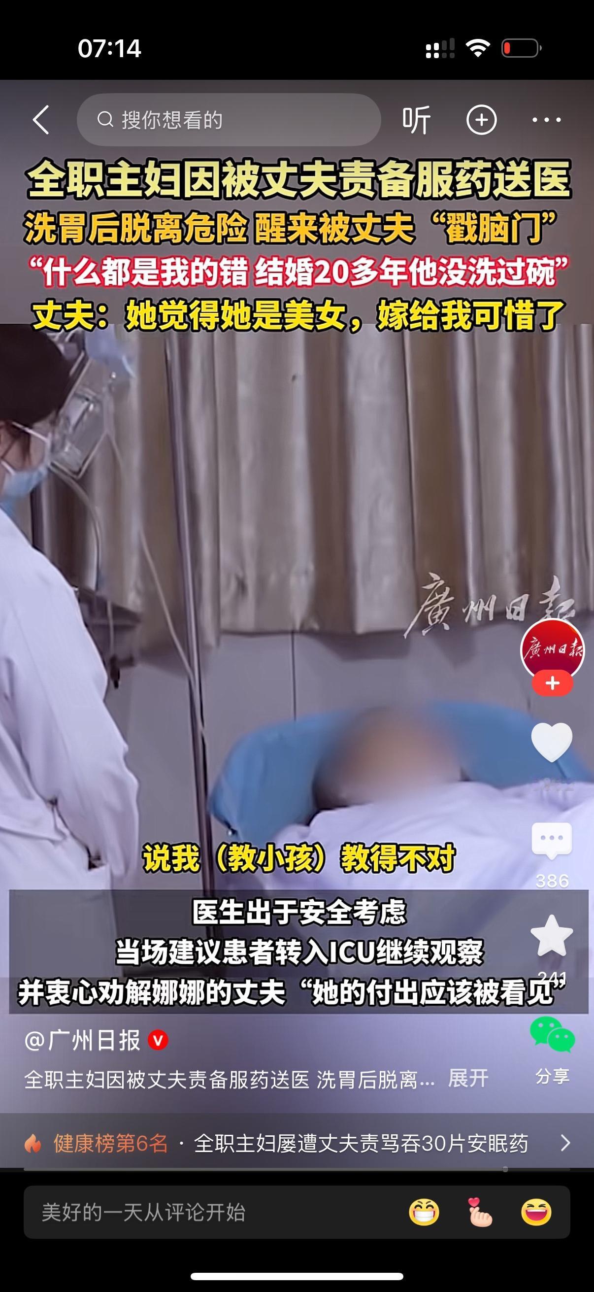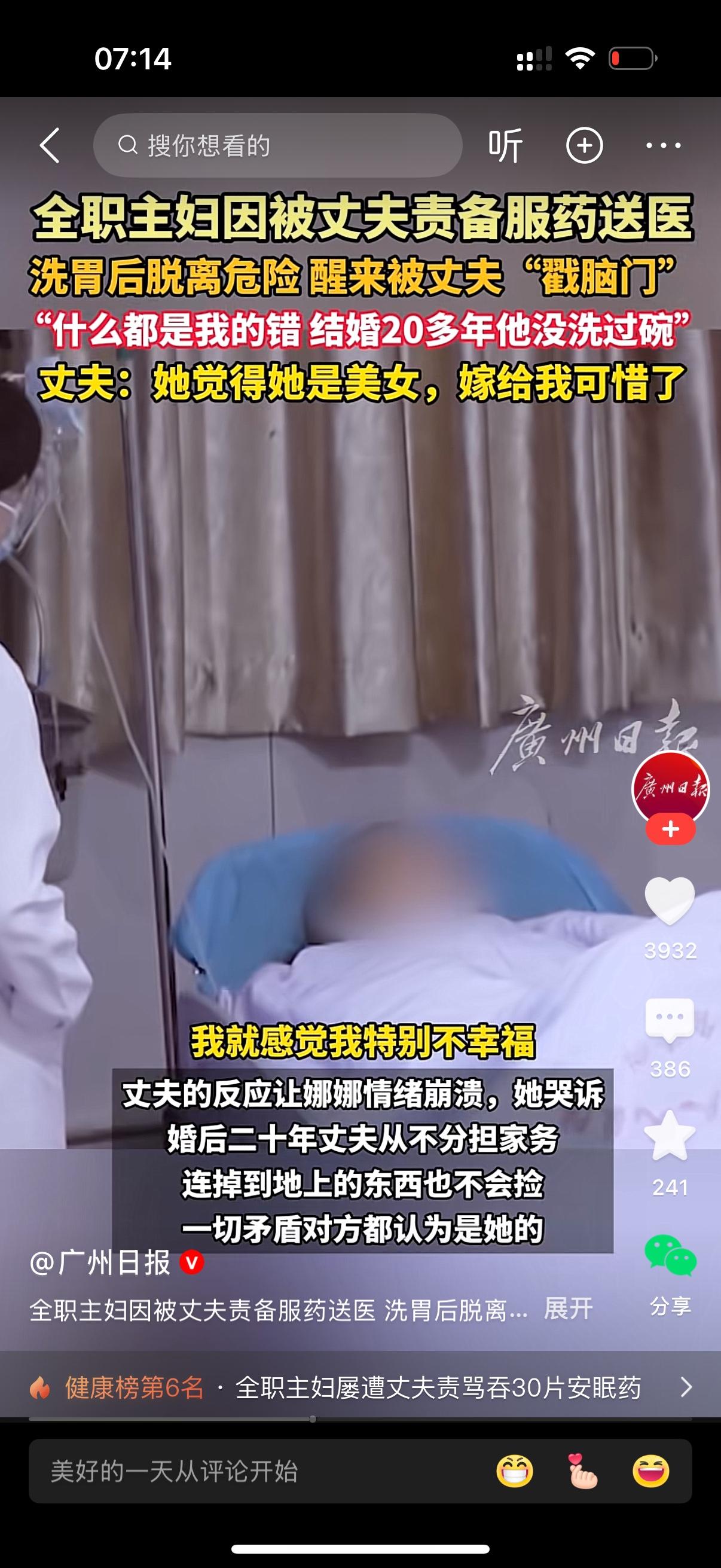 全职主妇因被丈夫责备服用30粒安眠药,被送往医院洗胃救治后脱离危险。丈夫在她醒来后戳她脑门说你就不容易死。丈夫的反应让女子情绪崩溃,她哭诉婚后20年丈夫从不分担家务,连掉到地上的东西都不会捡。一切矛盾对方都认为是她的。丈夫嫌自己教小孩教的不对,她感觉特别不幸福。男方则说,她觉得自己是美女,嫁给我可惜了。哎,结婚20年的夫妻还在相互埋怨,真是悲哀。