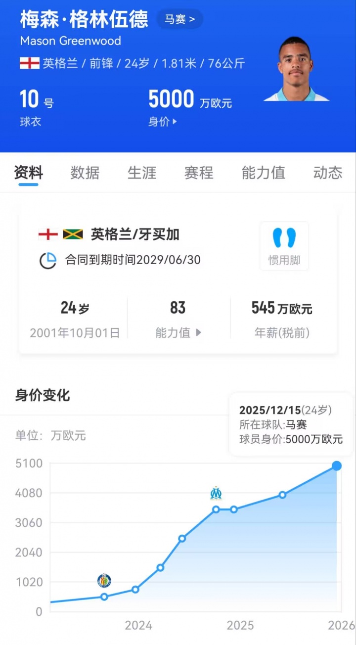 目前格林伍德的德转身价(去年12月15日更新)已经来到5000万欧元。20岁时,他曾因涉嫌家暴、强奸一度被停赛停训,德转身价也随之清零。但复出后,他还是逐渐展现出了自己的天赋,一步一步追平了自己被禁赛前的巅峰身价。不得不提的是,格林伍德如今也只有24岁。