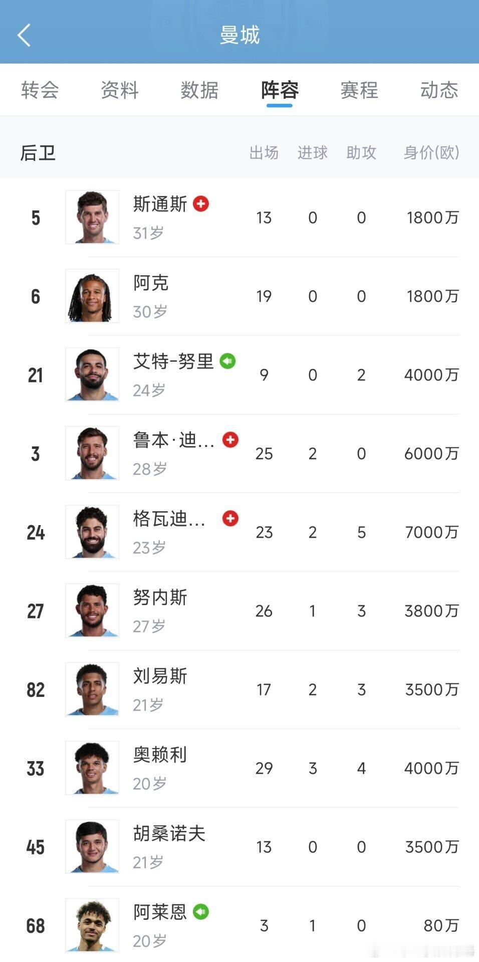 这储备太炸裂!加上格伊曼城防线储备己有11人,总身价达4.098亿0月17日据多方媒体报道,曼城将会签下25岁水晶宫后卫格伊。曼城曼城英超 因为曼城多名中卫受伤,所以球队不得不引援补充人手。格伊加盟曼城后,蓝月亮的后卫储备将达到11人,总身价4.098亿欧。若是去掉临时救火的小将阿莱恩,其他10人最低身价也有1800万欧,10人平均身价4090万欧。目前斯通斯、迪亚斯和格瓦迪奥尔是伤缺状态。若是3人回归,健康状态下曼城的后卫线非常恐怖,而且他们还有世界级门将多纳鲁马。曼城后卫线配置如下,加上身价5500万欧的格伊,11人总身价4.098亿欧。