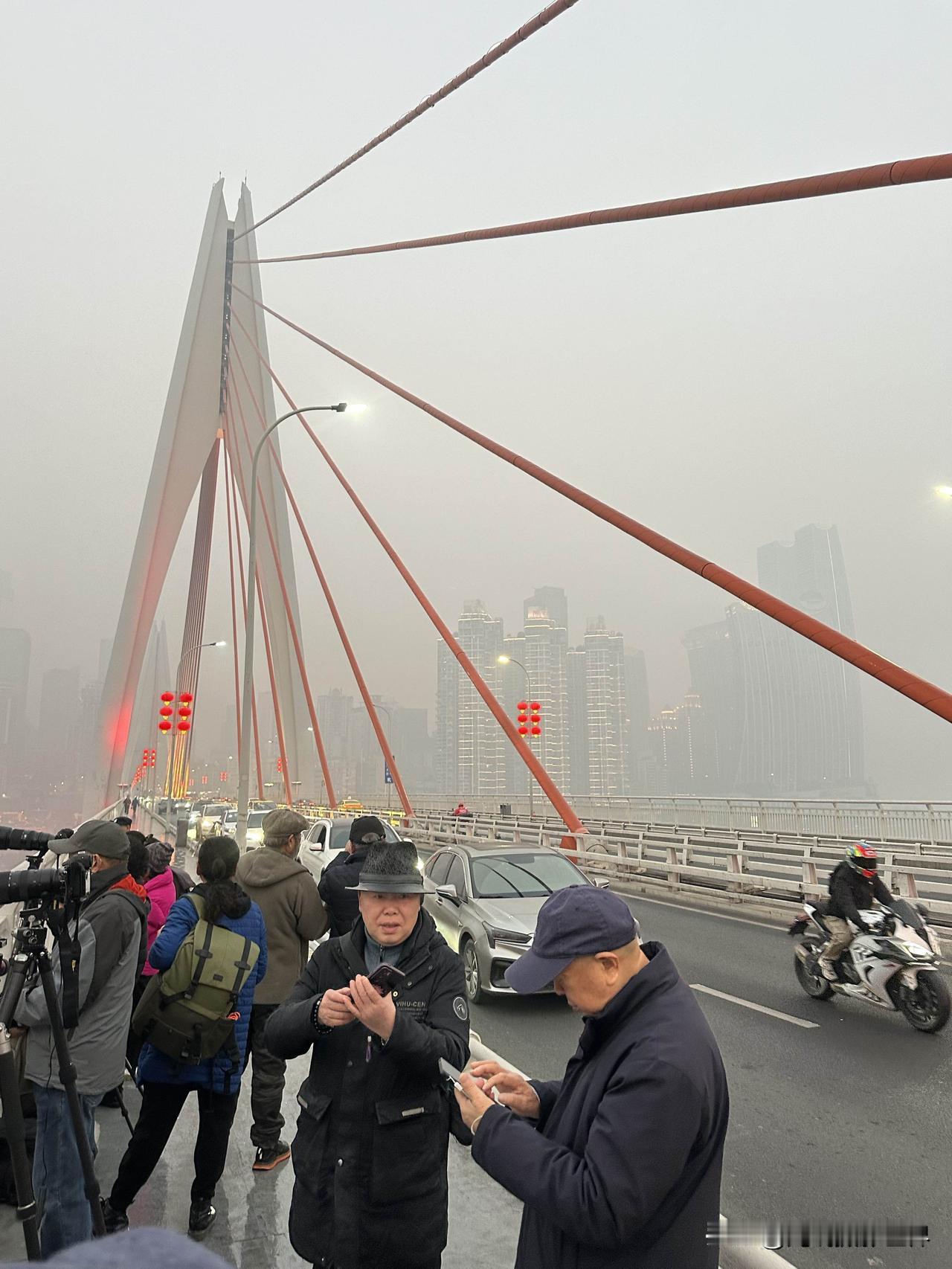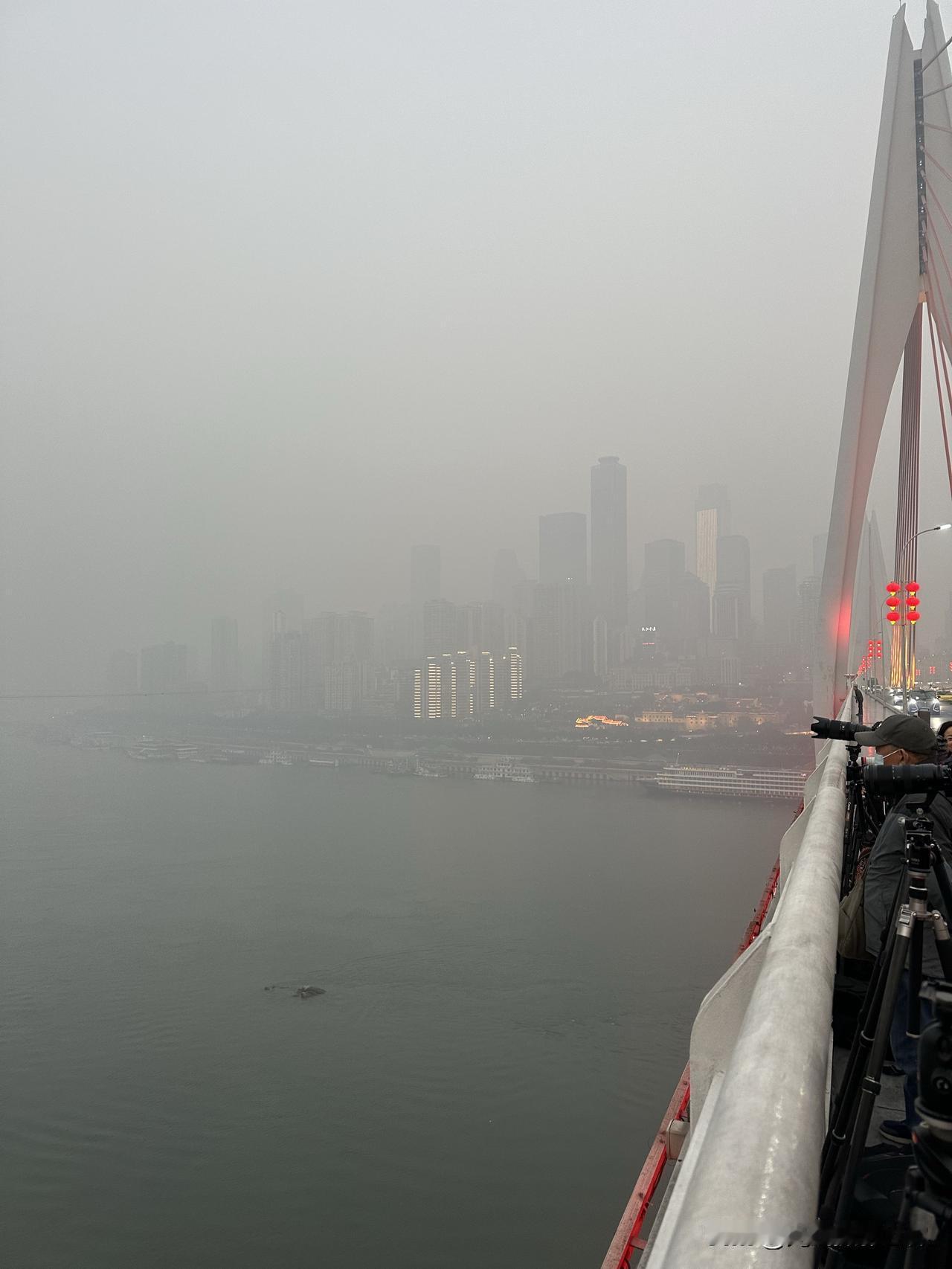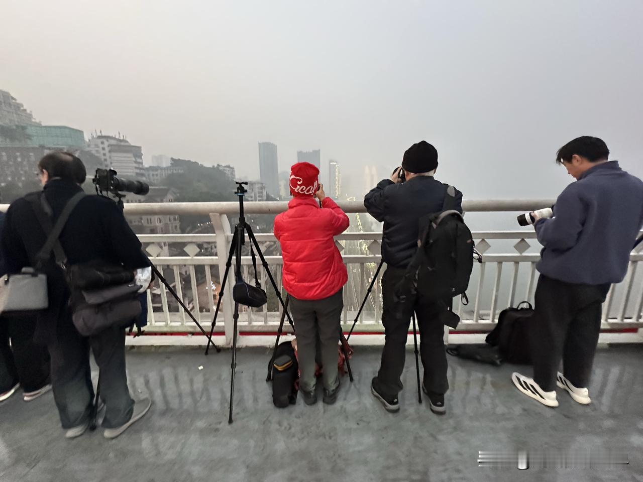 1月18日凌晨7点半,距离日出时间还有15分钟,但是,重庆东水门长江大桥上已经聚集了大批摄影发烧友,大炮林立,严阵以待,守株待兔! 今天上午8点半,发令枪响起时,张水华等2万多名外省市的马拉松跑者,将会在南滨路和巴滨路激烈角逐冠军和奖杯、奖牌、奖金! 重马,重庆马拉松,2026年,即将开跑啦! 此时此刻,重庆主城,雾气弥漫,应该比真正的大雾差点意思吧,虽然天气预报的大雾未出现,但是,也是名副其实的雾都重庆! 今天上午,重庆气温11-13度左右。 今天中午,重庆气温15-1 6度左右。 只是,美中不足,今天重庆空气质量不好,中度污染或者轻度雾霾。 因为昨晚上我没钱在南滨路住酒店,所以今天早上6点我就出门了,哎!真的好累,我是真的很不容易啊!重庆江边照片