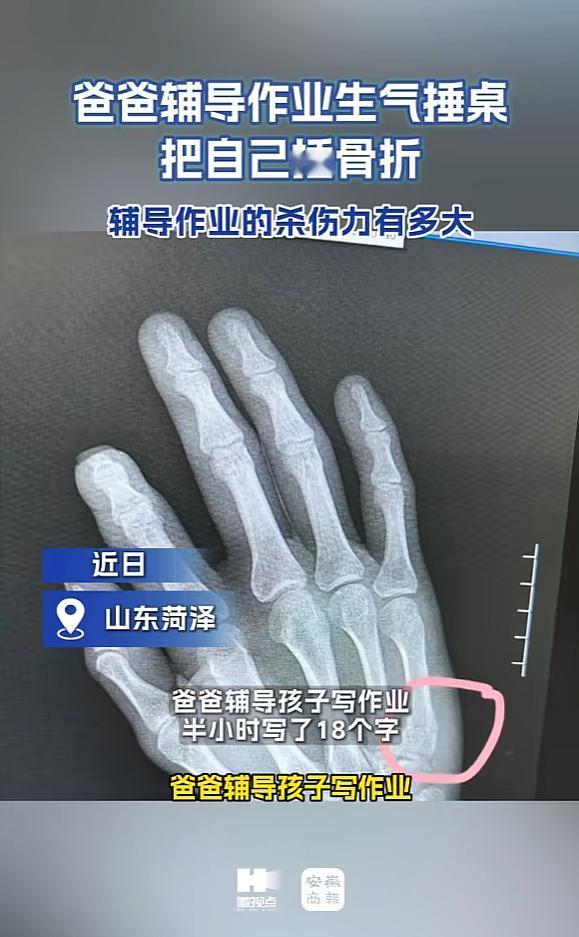 山东,一男子陪孩子写作业时,因孩子半小时只写了18个字,顿时火冒三丈,可他又舍不得打孩子,于是一拳头捶在桌子上泄愤,结果把自己手拍骨折了! 山东狠爹“自爆式”辅导作业:半小时仅写18字,怒拍桌案致骨折,网友:这届家长在渡劫 陪读这件事,究竟算不算“高危职业”?来自山东的张先生用一只惨烈骨折的手掌,向全社会提交了一份血泪斑斑的答卷。 1月13日那个注定不平静的夜晚,他亲自上阵监督孩子完成功课,未曾想这短短的三十分钟,竟成了他毕生难忘的梦魇。在那半个小时的漫长拉锯战中,作业本上的内容仅仅增加了区区18个字。这一惨淡的“战绩”,瞬间引爆了张先生积压的怒火。 那一刻,他只觉得全身的血液逆流,血压"噌"地飙到了天灵盖,掌心滚烫,仿佛正攥着一团随时要爆炸的烈火。本能驱使下,他高高扬起巴掌,原本是想狠狠拍醒眼前这个"小磨蹭",给孩子立个规矩。 然而,当目光触及孩子那双眼眶泛红、泪水在打转的眼睛,看到那副快哭出来的委屈模样时,身为父亲的本能让他心软了。就在千钧一发之际,他硬生生把手转了个方向,将满腔怒火连同雷霆万钧的力道,"砰"的一声砸向了面前坚硬的实木桌面。 这一下“急转弯”的后果可谓立竿见影:孩子毫发无损,依然安坐在椅子上,而张先生自己却遭了殃——手掌应声骨折,疼得他当场呲牙咧嘴,五官都在抽搐。这一幕被曝光后,围观网友不禁直呼:这哪是辅导作业,分明是"渡劫现场"! 一拳下去,骨头比孩子先"认错"回溯张先生的日常生活,由于平时职场事务繁忙,辅导孩子功课的重任,历来都是由妻子默默扛着。 那天,他难得早早结束工作下班回家,心血来潮主动请缨,想要亲身体验一把传说中的"父爱如山",殊不知最后却只体验了个寂寞与惨痛。他像尊门神一样盯着孩子足足快半小时,孩子手中的笔却仿佛重若千钧,根本没怎么动弹。 作业本上那稀稀拉拉的18个字,字迹潦草得仿佛需要拿放大镜才能勉强数清,每一个字都像是在挑战老父亲的底线。当时,张先生脑海中只剩下一个濒临崩溃的念头:这孩子是不是在跟我斗智斗勇? 在那只宽大的手掌高高扬起的瞬间,孩子那双充满恐惧与无助、委屈巴巴的眼睛直勾勾盯着他,晶莹的眼泪已经在眼眶里打转,仿佛下一秒就要决堤。正是这个眼神,击中了张先生内心最柔软的地方。心一软,手一偏,那股原本指向孩子的力量,最终全力砸向了无辜的实木桌。 一声沉闷的巨响过后,整个家都陷入了死一般的寂静,空气中只剩下他抱着红肿的手掌倒吸凉气的嘶嘶声。起初,张先生还抱有一丝侥幸,以为不过是皮肉之苦,红肿疼几天也就消了。 谁知事态发展远超预期,手掌不仅越来越肿,疼痛感更是呈几何级数递增,到了后来,连最简单的握拳动作都成了无法企及的奢望。妻子见状不敢怠慢,连夜推着痛苦不堪的他赶往医院急诊。医生一番检查后给出了诊断:掌骨骨折,这种伤势至少得安心静养一个月才能恢复。 手持诊断书,张先生唯有无奈苦笑。暗自庆幸未伤及孩子,不然凭那股力道,孩子怕是顷刻间就得被送进病房,着实让人后怕。半小时18个字背后,藏着多少家庭的崩溃边缘。 张先生的遭遇,绝非是个案,而是无数中国家庭晚间生活的真实写照。这一幕极具代表性的场景,瞬间引发了海量共鸣。有网友在评论区无奈留言说,自家那个"神兽"也是如此,简直是"玩的时候像兔子,写作业像树懒"。 上一秒在户外还能跟小伙伴不知疲倦地疯跑三公里,下一秒只要屁股沾上书桌前的椅子拿起笔,就开始眼神涣散、发呆、甚至沉迷于抠橡皮、频繁上厕所。 更有不少家长纷纷晒出了自己惨不忍睹的"战损记录":有人气急败坏到徒手把签字笔生生掰断。有人吼孩子吼到声带充血嗓子发炎。 甚至还有一位心态崩了的妈妈,因为辅导作业被气得当场大哭,转头还要面对孩子一脸天真地问妈妈你怎么了,那种无力感简直让人窒息。 针对这一普遍现象,教育专家曾深刻分析指出,孩子写作业磨蹭拖延,其本质原因往往在于专注力和时间管理能力尚未完全建立起来。 这个道理,其实家长们心里都懂。但当真正置身于那个环境,看着孩子五分钟才憋出一个字,那股"恨铁不成钢"的无名业火根本无法靠理智压制。张先生那根断裂的骨头,恰恰精准戳中了无数中国家长的痛点,想管教又怕伤害,想放手又怕耽误,最后只能把自己憋成"内伤"。 别让桌子替孩子挨打,也别让自己成了"炮灰"面对如此惨痛的教训,有网友不无幽默地调侃道:"辅导作业应该算工伤。"但在玩笑过后,这背后更深层的问题值得每一位家长反思——当情绪快要失控决堤时,我们究竟能不能在那一瞬间给自己按个"暂停键"? 毕竟,从长远来看,孩子成长的路很长,骨折的手却要疼一个月,这笔账怎么算都亏。 那些目前正因为辅导作业而处于"渡劫"状态的父母们,请务必记住:孩子平安健康,永远比作业本上的字更重要。 至于那令人焦虑的学习进度?真的急不得,也气不得,毕竟连桌子都会"报复"你。