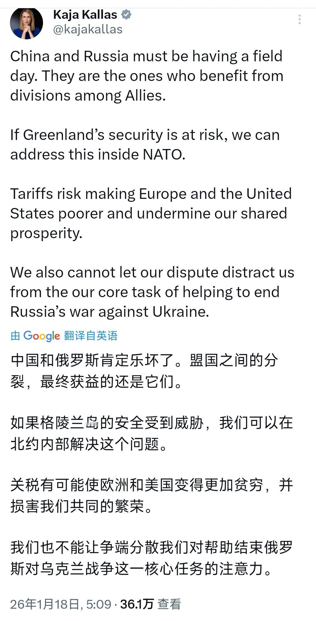 欧盟外交与安全政策高级代表卡拉斯今天(北京时间1月18日)发文写道:“中国和俄罗斯肯定乐坏了。盟国之间的分裂,最终获益的还是它们。如果格陵兰岛的安全受到威胁,我们可以在北约内部解决这个问题。关税有可能使欧洲和美国变得更加贫穷,并损害我们共同的繁荣。我们也不能让争端分散我们对帮助结束俄罗斯对乌克兰战争这一核心任务的注意力。” [机智]评几句:卡拉斯这番表态堪称现代版“斯德哥尔摩综合症”的荒诞注脚——面对特朗普明火执仗图谋格陵兰岛的地缘野心,以及动辄威胁加征50%关税的贸易讹诈,欧盟本应奋起捍卫自身利益,却陷入集体失语的束手无策。身为欧盟外交与安全政策高级代表,她非但未对盟友的霸凌行径提出半句质疑,反而强行将话题扯向中俄,把自身盟友体系的裂痕归咎于外部力量,这般避重就轻的话术着实令人咋舌。要知道,美国的关税威胁已导致欧洲核心产业面临重创,格陵兰岛的战略资源与航道更是被美方觊觎已久,真正破坏跨大西洋信任、损害欧洲繁荣的,正是这种单边施压的“掠夺性外交”。卡拉斯刻意转移焦点、维护霸权的表态,不仅暴露了欧盟在对美关系中的软弱与错位,更让所谓“盟友团结”沦为自欺欺人的笑话。