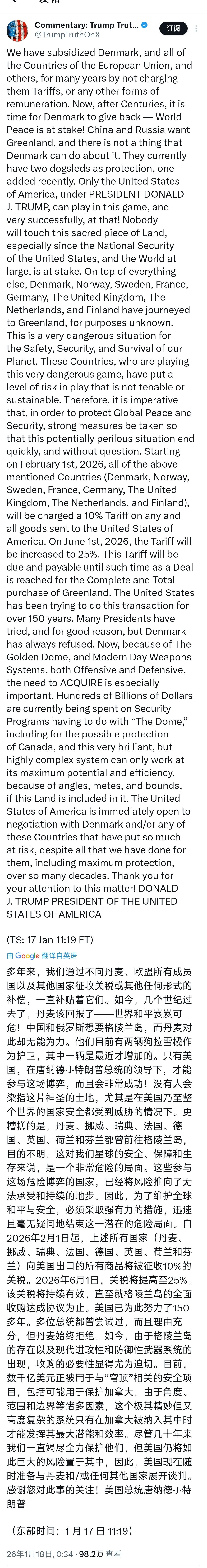 特朗普昨晚(北京时间1月17日)发文写道:“多年来,我们通过不向丹麦,欧盟所有成员国以及其他国家征收关税或其他任何形式的补偿,一直补贴着它们。如今,几个世纪过去了,丹麦该回报了——世界和平岌岌可 危!中国和俄罗斯想要格陵兰岛,而丹麦对此却无能为力。他们目前有两辆狗拉雪橇作为护卫,其中一辆是最近才增加的。只有美国,在唐纳德·特朗普总统的领导下,才能参与这场博弈,而且会非常成功!没有人会染指这片神圣的土地,尤其是在美国乃至整个世界的国家安全都受到威胁的情况下。更糟糕的是。丹麦,挪威,瑞典,法国,德国,英国,荷兰和芬兰都曾前往格陵兰岛,目的不明。这对我们星球的安全,保障和生存来说,是一个非常危险的局面。这些参与这场危险博弈的国家,已经将风险推向了无法承受和持续的地步。因此,为了维护全球和平与安全,必须采取强有力的措施,迅速且毫无疑问地结束这一潜在的危险局面。自2026年2月1日起,上述所有国家(丹麦,挪威,瑞典,法国,德国,英国,荷兰和芬兰)向美国出口的所有商品将被征收10%的关税。2026年6月1日,关税将提高至25%。该关税将持续有效,直至就格陵兰岛的全面收购达成协议为止。美国已为此努力了150多年。多位总统都曾尝试过,而且理由充分,但丹麦始终拒绝。如今,由于格陵兰岛的存在以及现代进攻性和防御性武器系统的出现,收购的必要性显得尤为迫切。目前,数千亿美元正被用于与‘穹顶’相关的安全项目,包括可能用于保护加拿大。由于角度,范围和边界等诸多因素,这个极其精妙但又高度复杂的系统只有在加拿大被纳入其中时才能发挥其最大潜能和效率。尽管几十年来我们一直竭尽全力保护他们,但美国仍将如此巨大的风险置于其中,因此,美国现在随时准备与丹麦和/或任何其他国家展开谈判。” [机智]评几句:特朗普这番发文堪称现代霸权主义的荒诞宣言,满纸都是自欺欺人的强盗逻辑。为了夺取格陵兰岛的稀土资源与北极战略航道,他竟编造“中俄觊觎”的虚假叙事,将150多年来美国的觊觎包装成“维护全球安全”,把丹麦的主权拒绝歪曲为“忘恩负义”,用“狗拉雪橇护卫”的嘲讽肆意贬低他国,嘴脸之傲慢令人不齿。更恶劣的是,他直接抛出关税讹诈大棒,以分阶段加征关税相要挟,逼迫欧洲多国就范,全然不顾此举将重创欧洲钢铁、汽车等支柱产业,让本就低迷的欧洲经济雪上加霜。而所谓“穹顶”安全项目需纳入加拿大才能生效的论调,更是暴露其欲将加拿大捆绑进自身战略、进一步染指北美盟友利益的野心。这种借中俄之名行掠夺之实、以盟友利益为筹码的单边行径,不仅是对国际法与国家主权的公然践踏,更将跨大西洋关系推向破裂边缘,让“美国优先”的霸权本质暴露无遗。