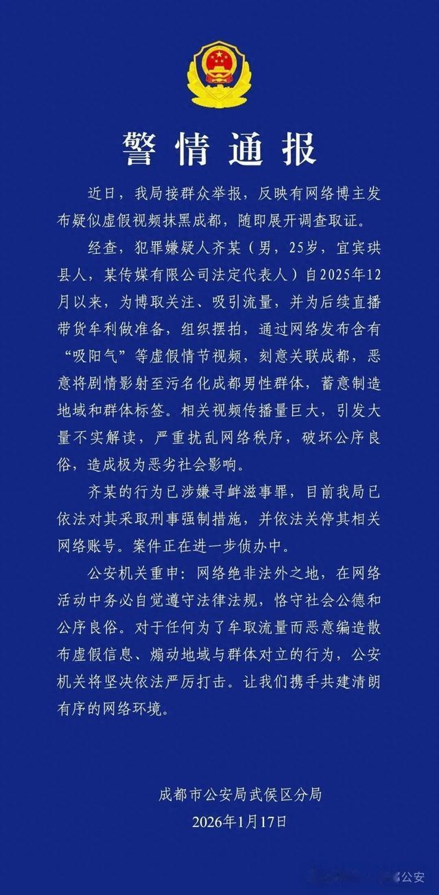 经查,犯罪嫌疑人齐某(男,25岁,四川省宜宾珙县人,某传媒有限公司法定代表人)自2025年12月以来,为博取关注、吸引流量,并为后续直播带货牟利做准备,组织摆拍,通过网络发布含有“吸阳气”等虚假情节视频,刻意关联成都,恶意将剧情影射至污名化成都男性群体,蓄意制造地域和群体标签。相关视频传播量巨大,引发大量不实解读,严重扰乱网络秩序,破坏公序良俗,造成极为恶劣社会影响。