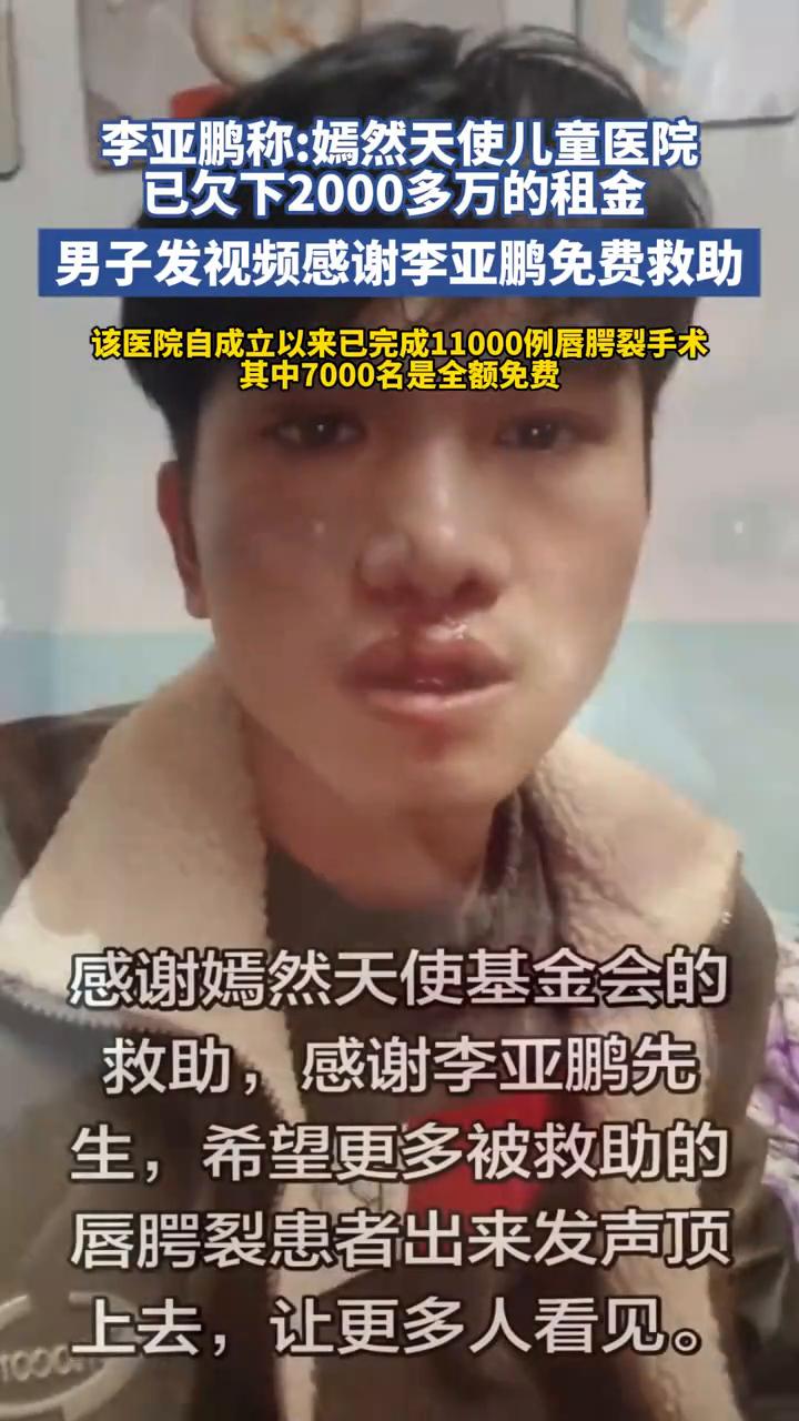 李亚鹏称:嫣然天使儿童医院已欠下2000多万的租金。 男子发视频感谢李亚鹏免费救助。该医院自成立以来已完成11000例唇腭裂手术,其中7000名是全额免费。 1月16日,贵州。感谢嫣然天使基金会的救助,感谢李亚鹏先生,希望更多被救助的唇腭裂患者出来发声顶上去,让更多人看见。我们帮的不是李亚鹏,是拯救更多的微笑天使!