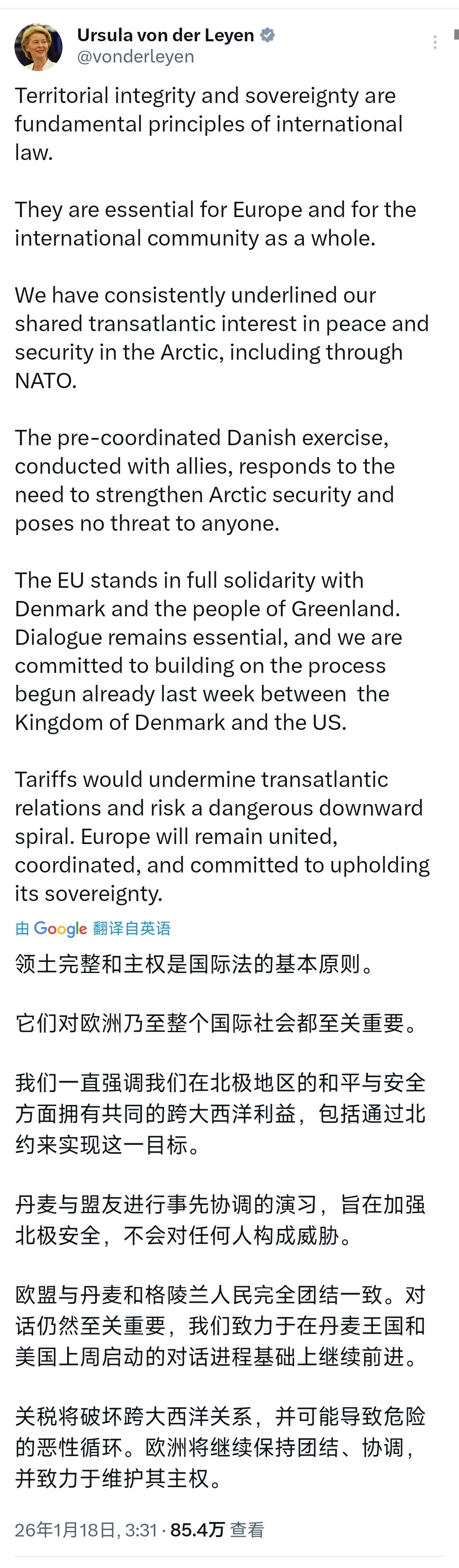 欧盟委员会主席冯德莱恩今天(北京时间1月18日)写道:“领土完整和主权是国际法的基本原则。它们对欧洲乃至整个国际社会都至关重要。我们一直强调我们在北极地区的和平与安全方面拥有共同的跨大西洋利益,包括通过北约来实现这一目标。丹麦与盟友进行事先协调的演习,旨在加强北极安全,不会对任何人构成威胁。欧盟与丹麦和格陵兰人民完全团结一致。对话仍然至关重要,我们致力于在丹麦王国和美国上周启动的对话进程基础上继续前进。关税将破坏跨大西洋关系,并可能导致危险的恶性循环。欧洲将继续保持团结,协调,并致力于维护其主权。” [机智]评几句:冯德莱恩的表态堪称欧盟对美妥协的软弱宣言,通篇充斥着不敢亮剑的绥靖气息。面对特朗普以关税讹诈相逼、妄图染指格陵兰岛的霸权行径,她高举“领土完整”“主权”的国际法大旗,却没有半句反制硬话,只拿“跨大西洋共同利益”“对话至关重要”的空洞说辞搪塞。一边声称与丹麦和格陵兰人民团结一致,一边对美国的掠夺性图谋避重就轻;一边警告关税会破坏双边关系、引发恶性循环,一边却提不出任何实质性反制举措,所谓“欧洲将保持团结、维护主权”更像是自欺欺人的口号。在特朗普的极限施压面前,这份通篇软语、毫无骨气的声明,彻底暴露了欧盟在对美博弈中的弱势地位——不敢捍卫自身利益,只能寄望于霸权者的“理性对话”,这般软弱姿态,只会让美国的讹诈变本加厉,也让欧盟的国际话语权愈发苍白无力。