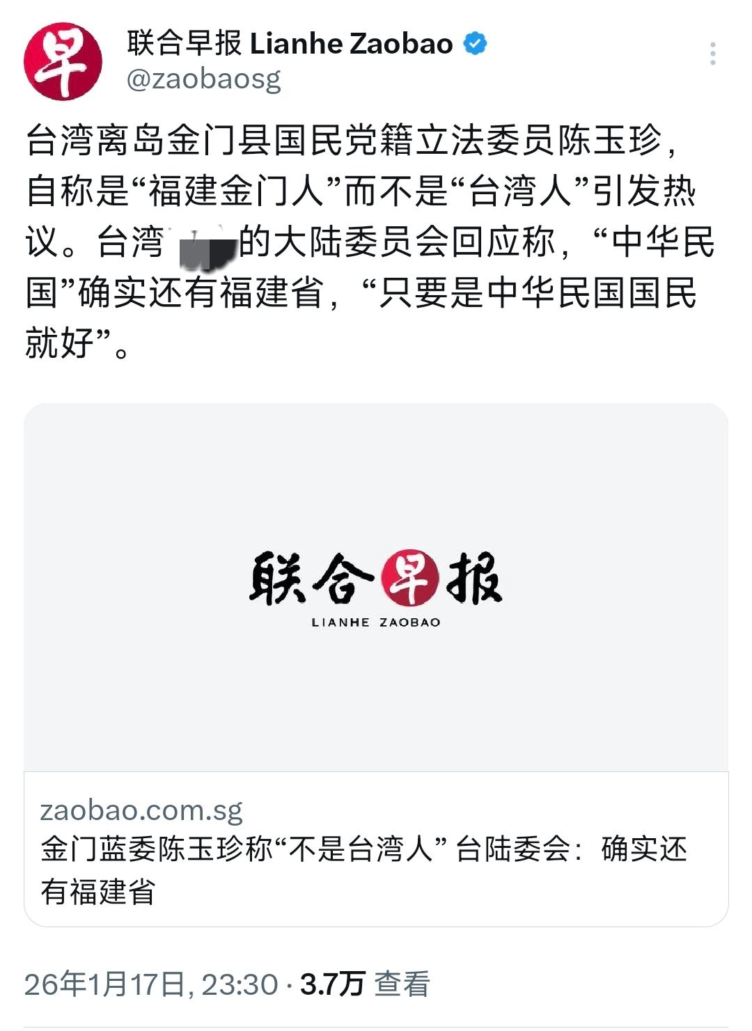 新加坡联合早报昨晚(1月17日晚)报道:“台湾离岛金门县国民党籍立法委员陈玉珍,自称是‘福建金门人’而不是‘台湾人’引发热议。台湾当局的大陆委员会回应称,‘中华民国’确实还有福建省,‘只要是中华民国国民就好’。” [机智]评几句:陈玉珍自称“福建金门人”的表态,恰似一把利刃戳破了“台独”的虚假泡沫,而台湾陆委会“中华民国仍有福建省”的回应,更让台独分子陷入自相矛盾的混乱泥潭。金门自古隶属福建,这是铁打的历史事实,绝非“台独”势力靠嘴炮就能篡改的定论。联合早报台湾编辑一会儿“台湾”、一会儿“台湾政府”、一会儿“中华民国”的错乱表述,恰恰折射出“台独”主张的逻辑崩塌——既无历史依据支撑,又无法理根基背书,从头到尾都是情绪化的虚妄发泄。妄图割裂金门与福建的血脉联系,妄图将台湾从中国版图中剥离,这种违背历史潮流、无视民族大义的行径,终究只是自欺欺人的笑话,在铁一般的事实面前,只会显得愈发荒诞可笑。