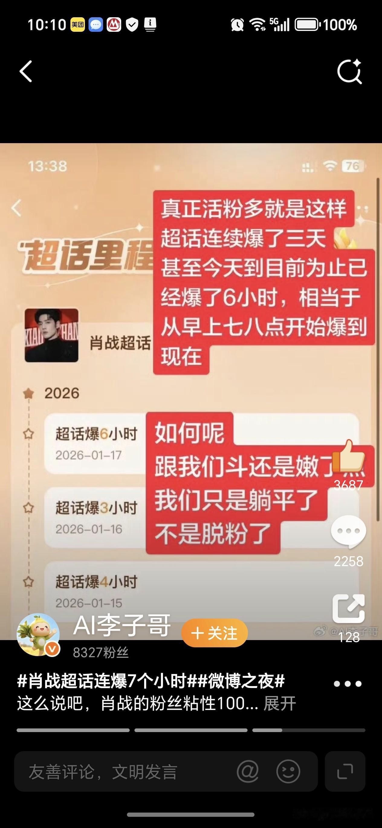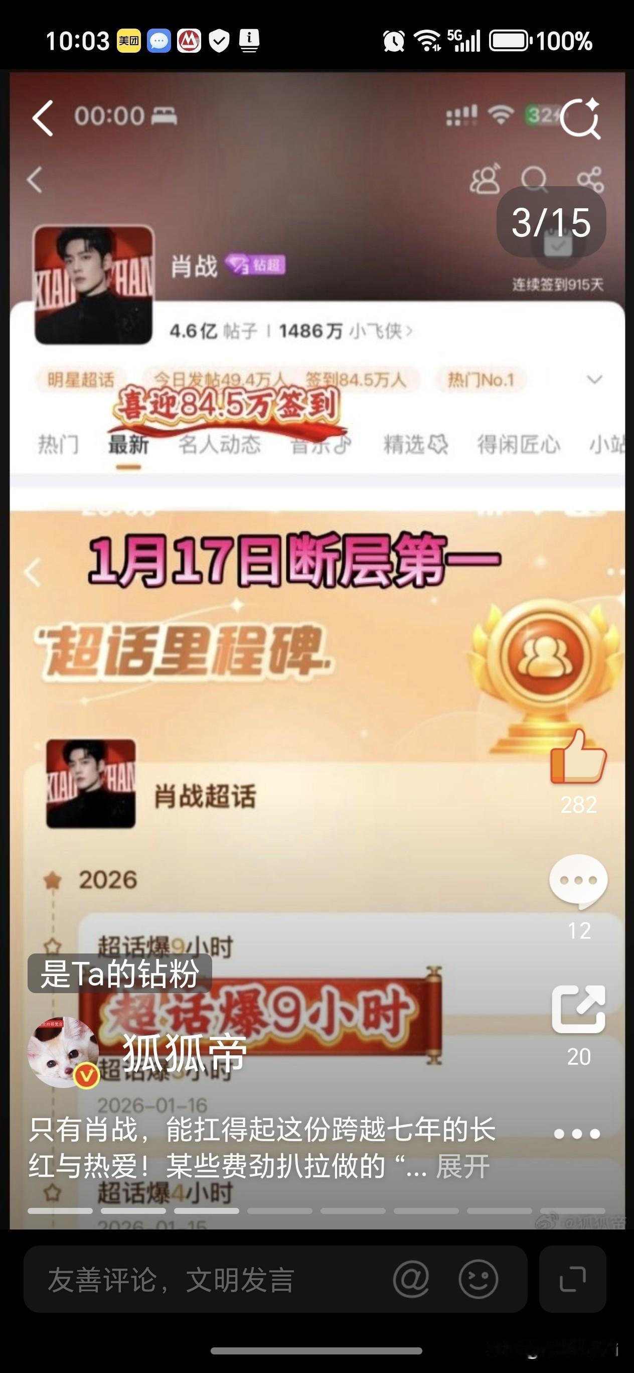 肖战粉丝没有官方后援会,小飞侠都是散落在世界各个海域,这次为了争取见肖战的晚会门票,四处召集小飞侠,这召集的粉丝也只是冰山一角。 但就这一点活粉已足以在内娱断层,肖战超话被活人签到发帖讨论度连连搓爆,已连爆第四天,超话签到近85万,只有活人才能做到如此恐怖如斯,机器是万万做不到的,难怪统计肖战粉丝凝聚力都是100%,因为肖战值得肖战 今天继续,还有三天[加油]