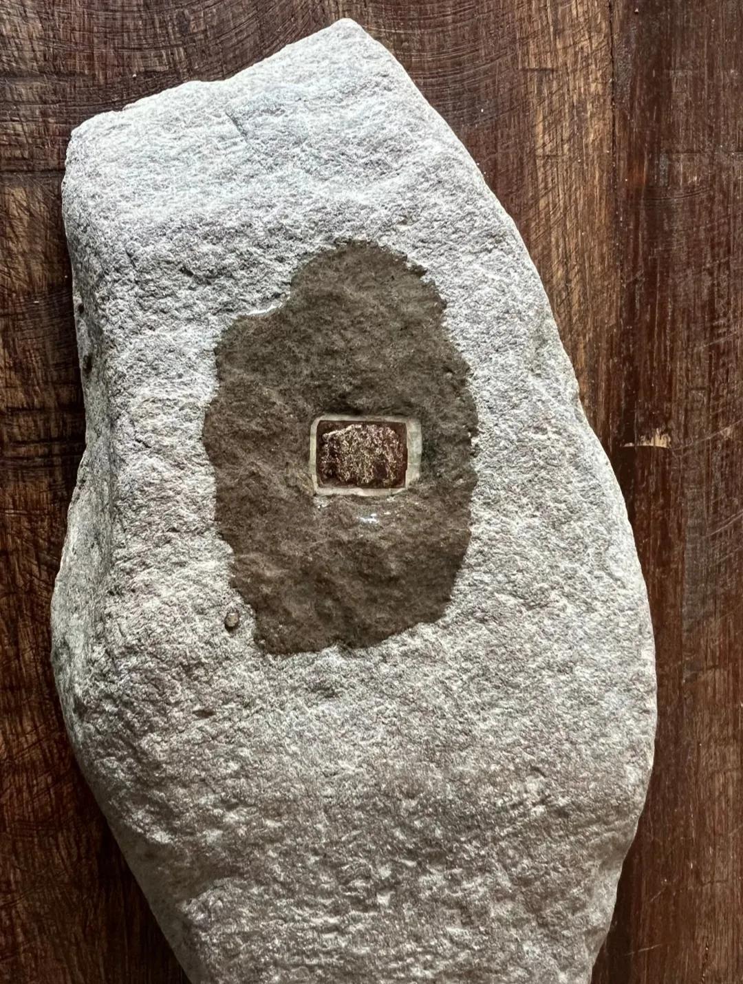 徒步时山里捡到一块奇特的石头,上面有一块方形的金属块,有懂是什么的吗?有人说是黄