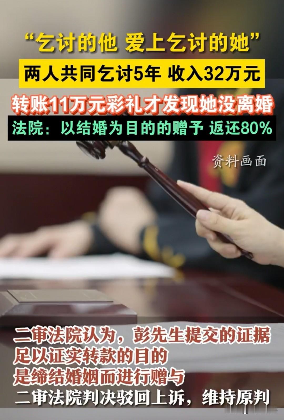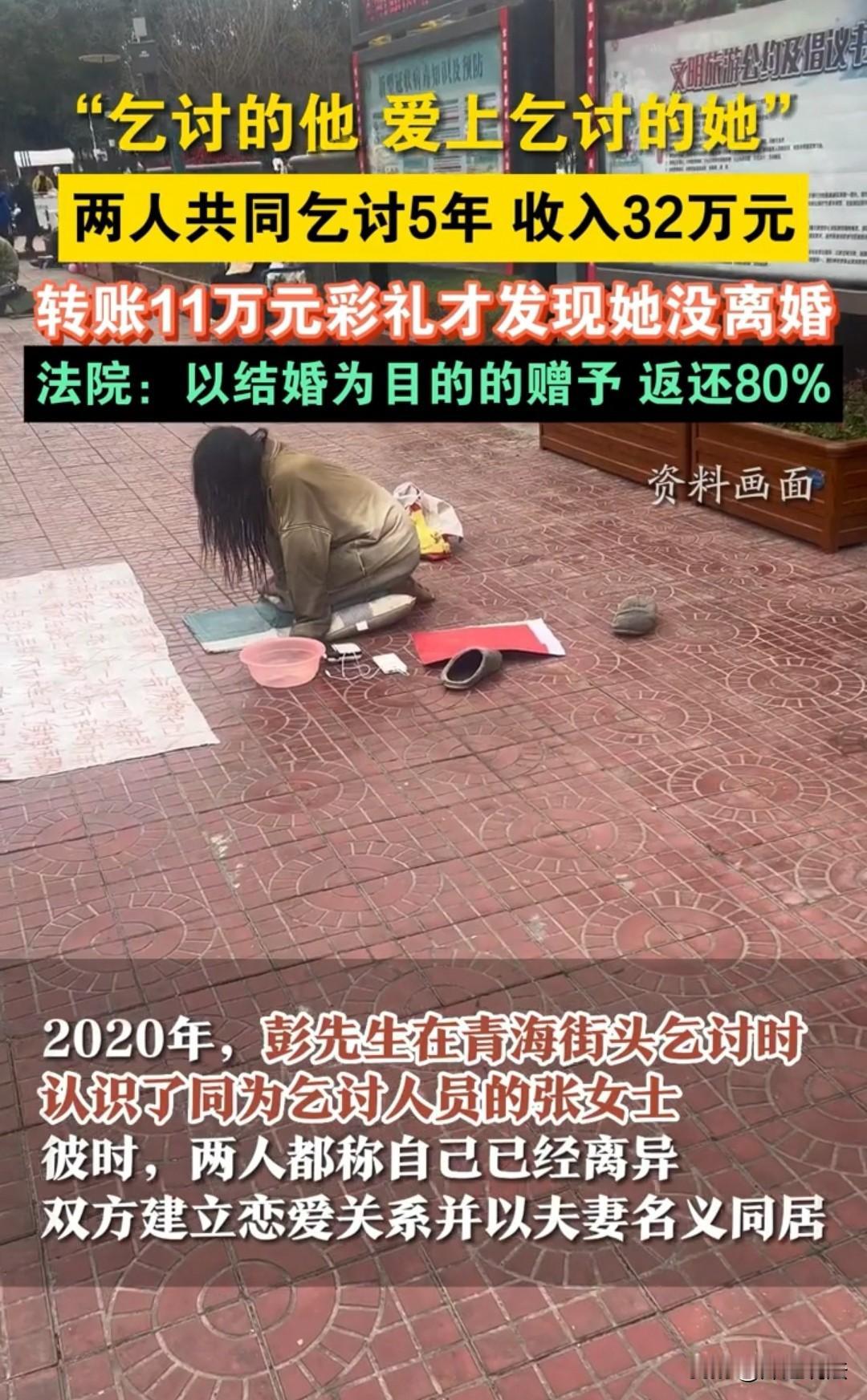 青海,有个彭大哥,跟一个女乞丐街头相识,俩人搭伙乞讨整整5年,居然攒下32万!老彭是个实心眼,满心想着好好过日子,直接转11万彩礼要结婚,转头才惊觉女方压根没离婚!要钱被拒直接告到法院,女方耍赖拿不出证据,二审照样判返8成,五年辛苦全白搭了! 话说2020年,彭大哥在青海街头讨生活,那日子过得是真难,拄着个自制拐杖,穿得破破烂烂,寒风里伸着个搪瓷碗,眼看都快撑不下去了。就在这时候,碰到了也在乞讨的张女士,俩人一搭话,那叫一个同病相怜。 张女士主动问他“今天收成咋样”,俩人一聊才知道,都自称是离异单身,都是被生活逼得没办法才出来乞讨的。 你想啊,俩苦命人碰到一起,自然就亲近了,没多长时间就搭伙过日子,以夫妻名义同居,一起上街乞讨,也算有个照应。 谁能想到,这俩人一搭伙就是5年,还摸索出了“门道”——彭大哥就在繁华路段待着,靠着腿脚不方便的样子让人同情;张女士就去小吃街,看着柔弱可怜,路人也愿意多帮衬。 每天收工,俩人就把讨来的零钱凑一起,数数清楚,分类存银行。5年下来,你猜怎么着?居然攒了32万!这数儿,说出来谁信啊,乞讨都能攒这么多,也是没谁了。 到了2024年春天,张女士突然提出来,想“名正言顺”在一起,张口就要20万彩礼。 彭大哥寻思着,俩人都一起苦了5年了,感情也到位了,彩礼就是个形式,也是对未来的承诺,就咬咬牙,先后转了11.19万给她。 结果你猜怎么着?钱刚转完没几天,俩人就因为乞讨来的钱怎么分吵崩了!本来感情就因为钱生了嫌隙,更让彭大哥崩溃的是,他偶然间发现,张女士根本没离婚! 人家跟老公的婚姻关系一直好好的,之前说的“离异”全是瞎话! 彭大哥当时就炸了,拿着婚姻登记信息质问她“你当初不是说你离婚了吗?这到底是怎么回事!” 结果张女士倒好,满不在乎地说“那都是过去的事了,咱俩都在一起这么久了,彩礼还能往回要?” 你说气人不气人?彭大哥找她要了好几次钱,她都不给。没法子,彭大哥只能起诉到法院,说“我给她钱就是为了结婚,现在她没离婚也不跟我结,这钱必须还我”。 一审的时候,张女士还狡辩,说这11万不是彩礼,是“俩人一起乞讨的收入,还有我给她当保姆的辛苦费”,死活不肯还。 但法院一看彭大哥的转账记录、聊天记录,明明白白就是彩礼,是奔着结婚给的,直接判张女士返还80%。 张女士还不服,又上诉了,说这钱是共同乞讨的钱,还有她照顾彭大哥的劳务费。结果二审法官也不吃她那套,直接驳回上诉,维持原判! 为啥?因为彭大哥的证据太实了,而且张女士隐瞒没离婚的事,本身就不占理。 你说这事儿闹的,俩人一起讨了5年饭,攒了32万,本来想好好过日子,结果因为这档子事,闹得鸡飞狗跳,最后还得返还人家8万多。 彭大哥这5年罪算白受了,感情是假的,钱也差点打了水漂,真是又好气又好笑,纯粹一场闹剧! 根据《民法典》和相关规定,彩礼本来就是以结婚为目的给的钱,要是婚没结成,给彩礼的人就能要回去。 法院判张女士还80%,也是考虑到俩人确实一起过了5年,而且张女士隐瞒婚姻状况有错,这么判挺公平的。 至于张女士说的共同乞讨收入、保姆费,没证据没书面约定,法院肯定不认可。 还有啊,张女士没离婚就跟彭大哥以夫妻名义过,虽然没犯法,但确实对不起她老公,也违背了婚姻该有的忠实义务,这事儿她本身就不占理。 以后大家不管是处对象,还是涉及钱,都得把眼睛擦亮,核实清楚对方情况,证据也得留好,别让人坑了! 对于此事,大家如何看? 素材来源于冀时新闻
