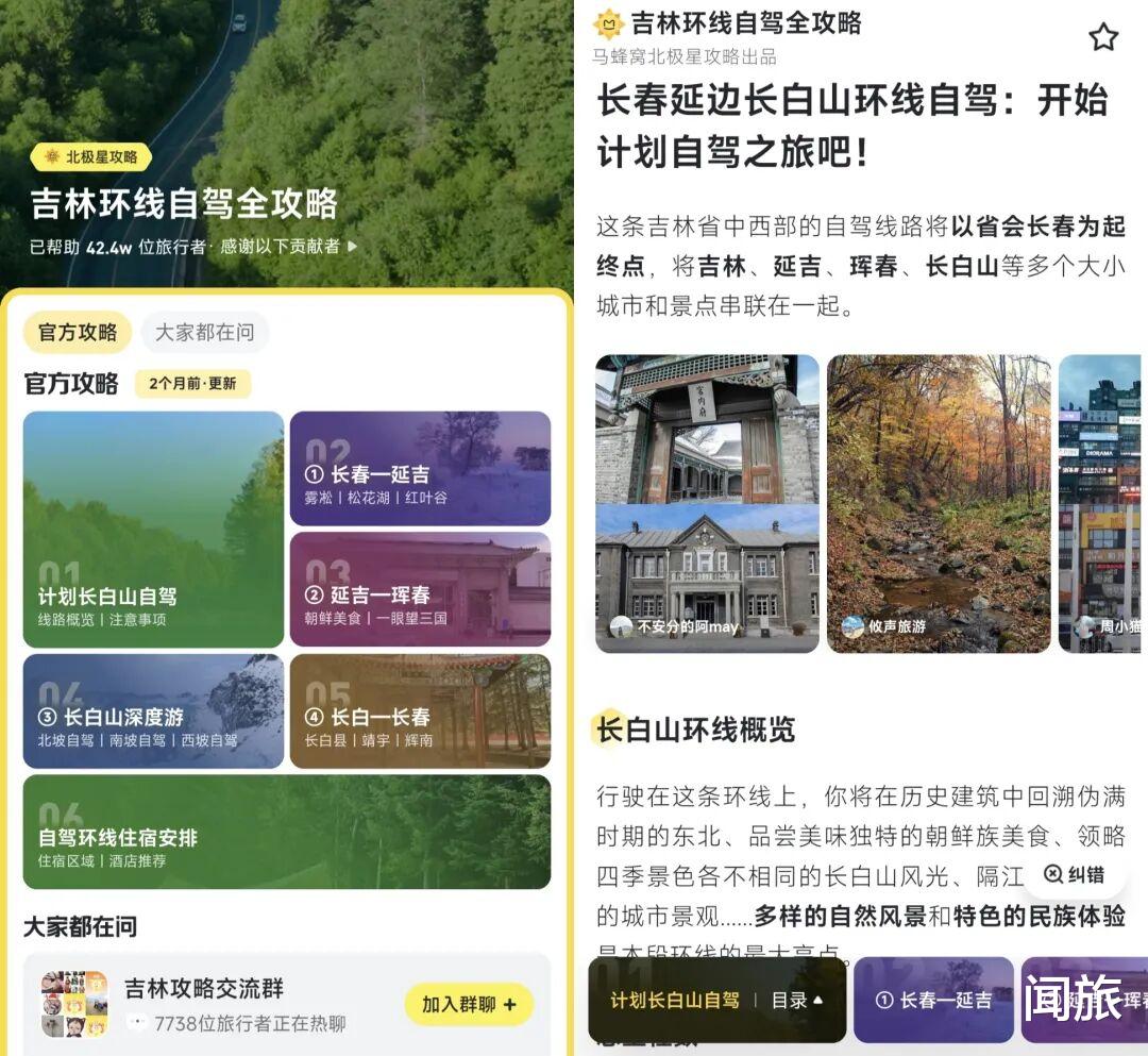 就拿北极星攻略曾发布过并且很受欢迎的一套吉林自驾环线攻略为例,不仅从线路上给用户提供了覆盖长春至长白山环线自驾线路规划、环线美食&住宿推荐及长白山西南北坡特色玩法等不同选择,还很大程度上丰富了长白山自驾旅行内容信息。
