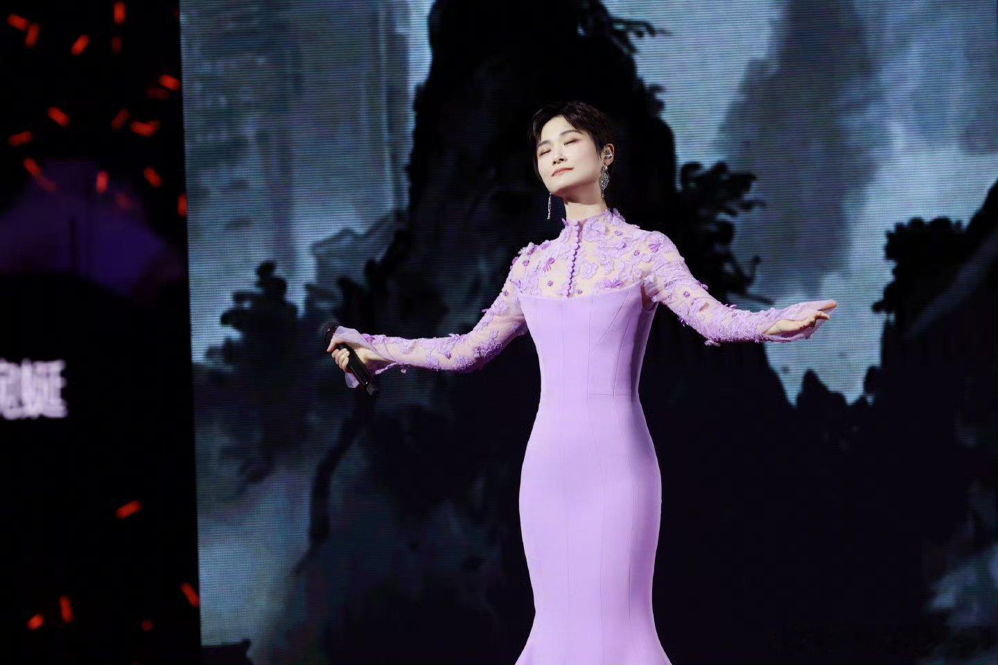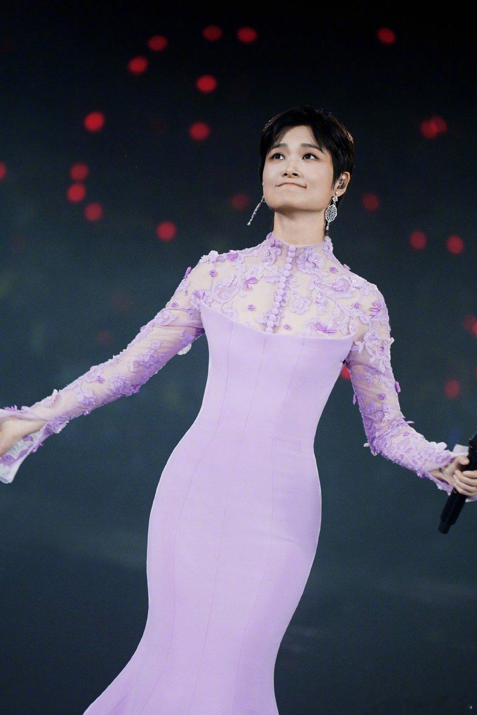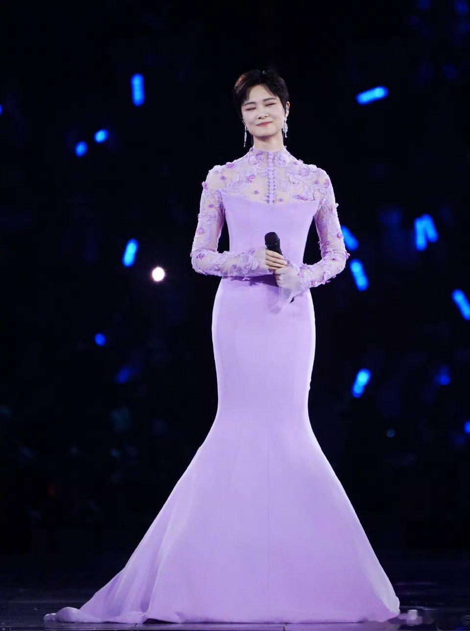 李宇春「2026皇后与梦想巡回演唱会」上身一套Azzi&Osta 24秋冬高定粉紫鱼尾长裙,拖尾显得身材更加修长,各种造型都能驾驭百变女王
