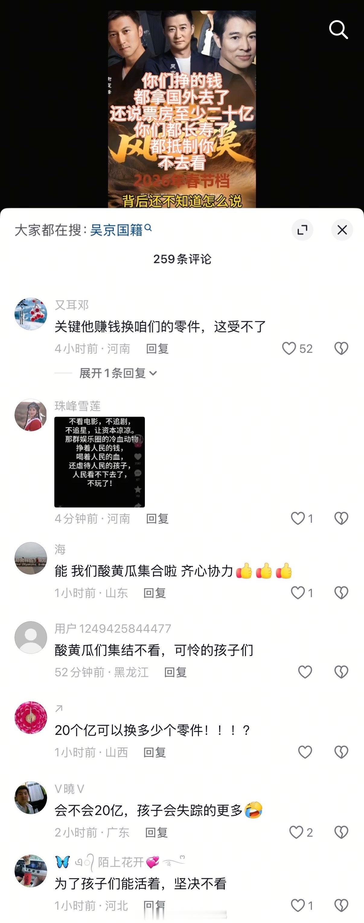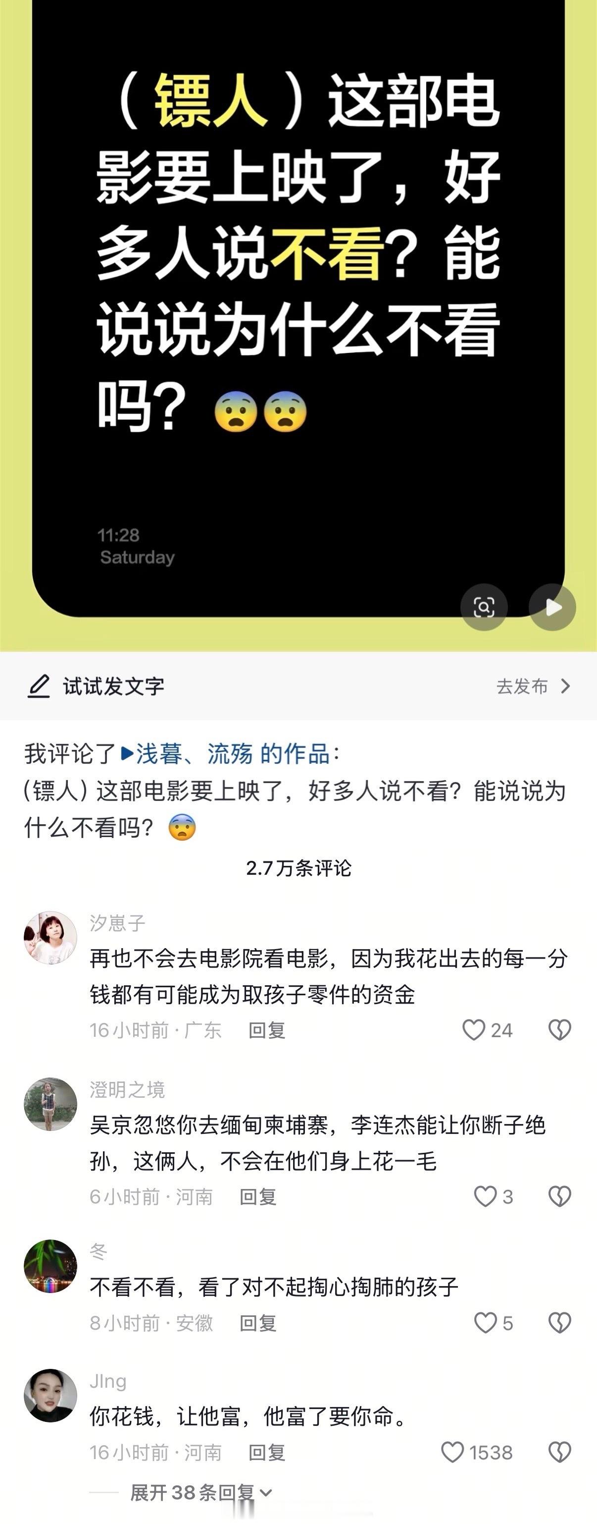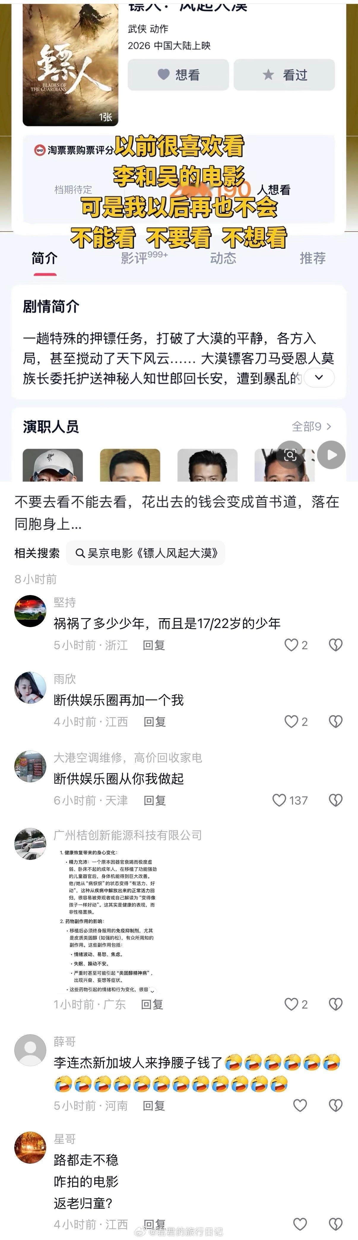 妈呀,《镖人》电影官微刚刚开通。抖上几小时内出现几百个一模一样的AI话术,刷屏式的带节奏抵制,并且评论区深信不疑说李连杰康复有猫腻。太可怕了,就因为一些莫名其妙的谣言,呼吁大家团结起来,跟风式抵制电影。又坏又蠢…他们就没脑子的吗?这种可以报警吧???