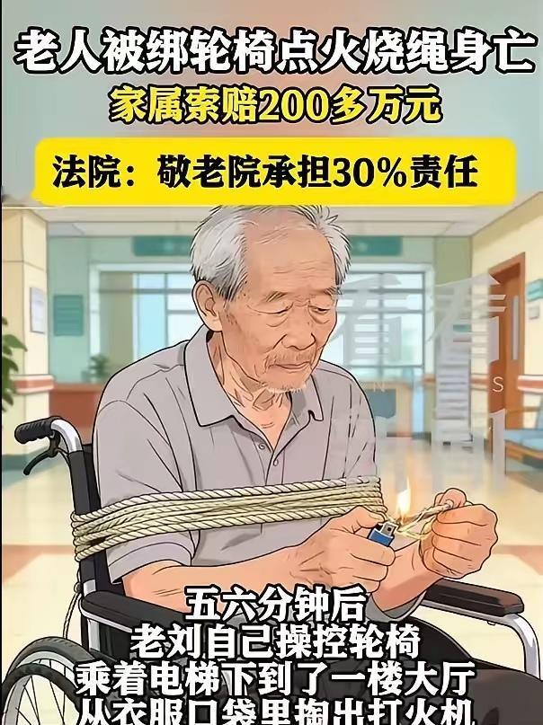 上海,一60岁男子有4级残疾证,左腿跛脚,被家人送进养老院,可老头能作人,凌晨2点不睡觉大吼大叫,被护理员绑在轮椅上,男子竟拿出打火机,想烧断绳子,万万没想到,惹祸上身被烧身亡,家属愤怒的向养老院索赔200万,法院判决让人直呼太意外。 据1月17日光明网报道,刘大爷才60岁,就被兄弟送进养老院,他虽然年纪不大,但生活不能自理了,因为他4级残疾,左腿还坡脚。 案例中没说刘大爷的婚姻状况,应该是孤家寡人一个,因为他出事后,是兄弟跟养老院对簿公堂的。 那么,刘先生到底出了啥事呢?这得从刘大爷的脾气说起,他这个人很倔,而且脾气暴躁。 这也能理解,谁愿意生活在养老院,每天吃了睡睡了吃,没有自由,死气沉沉,一天一天的熬着日子? 所以,刘大爷平时很难相处,一不对心思就大吼大叫,发泄着自己内心的郁闷和不满。 2025年2月12日凌晨2点多,刘大爷一觉醒来,说啥都不想睡了,他想坐轮椅出去活动活动。 当时值班的是护理员孙某,他可不是光照顾刘大爷一个人,同时要兼顾好几个老人,把他忙的手忙脚乱。 孙某一开始劝刘大爷再睡会,这才凌晨2点多,是睡觉时间,也不适合活动呀。 可刘大爷就是不听,非得要起床,孙某一看安抚不住他,不遂他心意,他就劈头盖脸的呵斥自己。 无奈之下,只能对他言听计从,给他穿衣穿鞋,抱到轮椅上,然后把他推到6楼大厅,不能让他影响别人睡觉。 可孙某还要去照顾其他老人,也不能一直陪着刘大爷呀,但离开后,又怕刘大爷身体不便,从轮椅上摔下来。 孙某的担心可不是多余的,因为刘大爷2024年12月的一天,就在养老院摔过一次,而且很严重,头上被摔出一个血窟窿,肋骨断了5根,锁骨还断了一根,如今刚恢复好,可不能大意。 为了刘大爷的安全,孙某决定把他绑在轮椅上,等自己忙完了,再来照顾他。 这可把刘大爷气坏了,谁愿意被五花大绑呀,他气哼哼的操作轮椅,坐电梯来到一楼大厅。 手脚被束缚,真是太难受了,他决定挣脱出来,竟从衣服口袋里拿出一个打火机,这是他偷偷抽烟用来点火的。 刘大爷想用打火机烧断绳子,可万万没想到,火竟然把轮椅点着了,他瞬间葬身火海。 火从凌晨3点25分,烧到4点17分,等警方赶到,刘大爷已经身亡。 养老院拿出25万给刘大爷操办了后事,刘大爷的兄弟愤怒的向养老院索赔200万。 在家属看来,护理员把刘大爷五花大绑,身边没人陪护,导致刘大爷出了意外,严重失职。 养老院觉得很委屈,自己有错,但刘大爷的错更大,他是个有行为能力的人,应该知道用火烧绳子,后果不堪设想,他应该为自己的行为负责。 双方都有错,老刘大喊大叫影响别人被管理人员束缚,老刘为了自由用打火机烧绳子,结果造成悲剧,做为一个成年人应该懂火的危害。养老院管理员把老刘绑住让其失去自由而不是安慰,行为粗暴,院方管理不善也应负责。 有人认为,60岁也不能算老,为什么要住进敬老院?虽然他自身有一定责任,敬老院工作人员失职才是导致死亡结果的根本原因。这个敬老院监控室没人值守? 刘大爷虽说脾气倔、爱折腾,可他毕竟是个生活不能完全自理的残疾人,心里憋屈发泄下,也能理解。 但养老院处理方式也太简单粗暴了,把刘大爷绑轮椅上,这不是限制人家自由嘛,还留他一个人,出了事谁负责? 刘大爷自己也有错,用打火机烧绳子,这不是玩火自焚嘛,他应该清楚火有多危险,可还是这么干了,也得为自己的行为买单。 不过话说回来,养老院责任更大,作为专业机构,得好好照顾老人,不能这么敷衍。 就算刘大爷难管,也得想别的办法,不能一绑了之。家属索赔200万有点多,但养老院肯定得担责。 这悲剧也提醒大家,养老院得提升管理水平,多些耐心和爱心;老人们也得控制下情绪,别干危险事儿。希望以后别再出这样的事儿了,让老人们能安享晚年。 《民法典》第1169条规定:教唆、帮助他人实施侵权行为的,应当与行为人承担连带责任。 养老院存在“帮助”行为,护理员孙某用尼龙绳将刘大爷捆绑在轮椅上,虽出于防摔目的,但客观上限制了其行动自由,且未全程监护。 此行为为刘大爷后续危险举动烧绳子提供了条件,构成“帮助”风险发生。 养老院的捆绑行为违反《老年人权益保障法》对人身自由的保护,属违规约束;把行动不便且情绪激动的老人单独滞留公共场所,且监控室无人值守,没及时响应火情,从3:25起火至4:17警方到场无人干预,管理存在重大疏漏。 刘大爷自身也有过错,他作为完全民事行为能力人,明知打火机点火危险仍使用,且此前曾因抽烟引发火情,属自陷风险。 养老院的捆绑和失管是损害的间接原因,刘大爷主动点火是直接原因。 按过错比例,最终,一审法院认为判决养老院占30%的责任,赔偿家属60多万元,体现“责任与过错相适应”原则。 家属不服,提起上诉,二审维持原判。 关注@灋律盐究员 学法辩是非,用法止纷争。