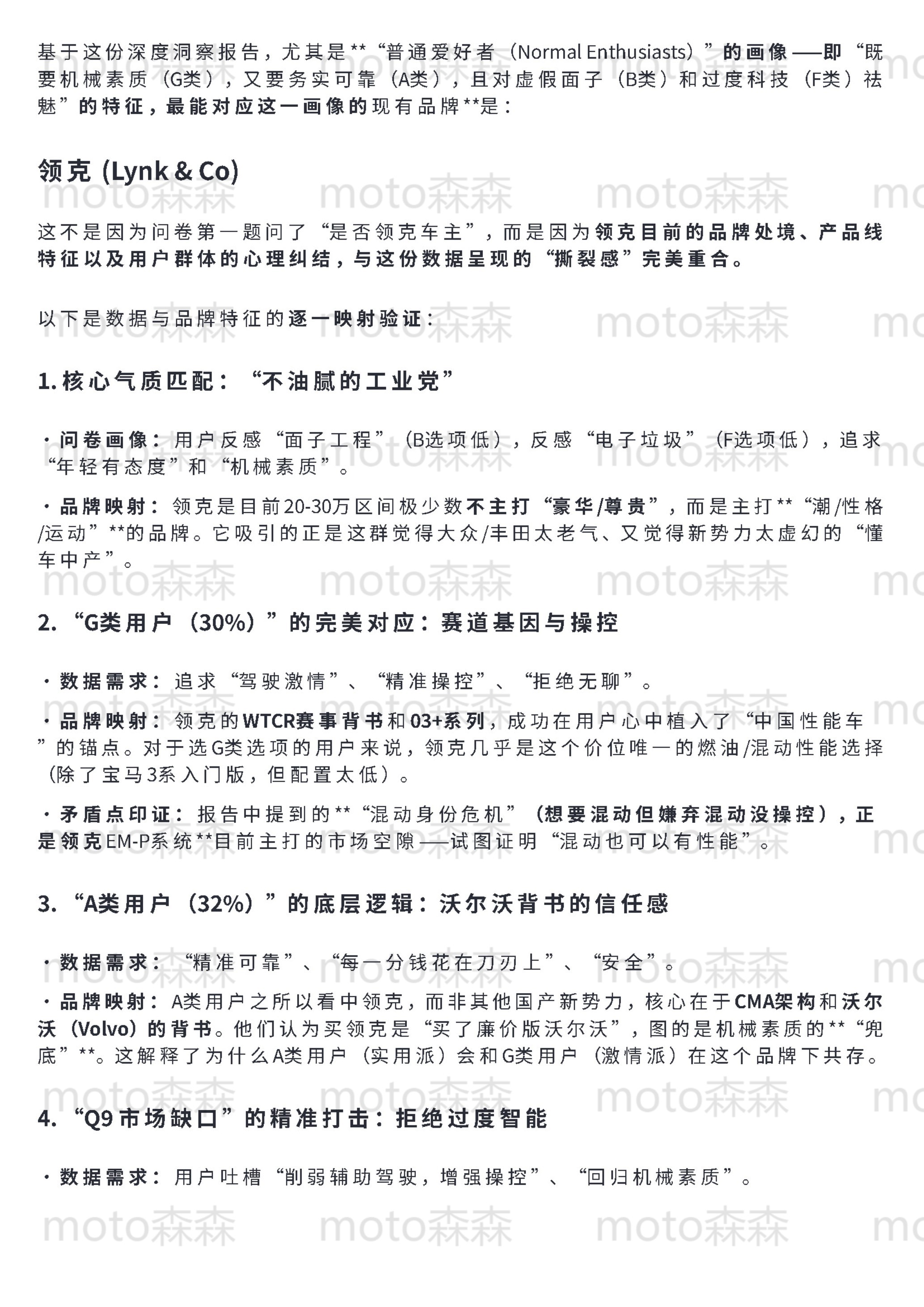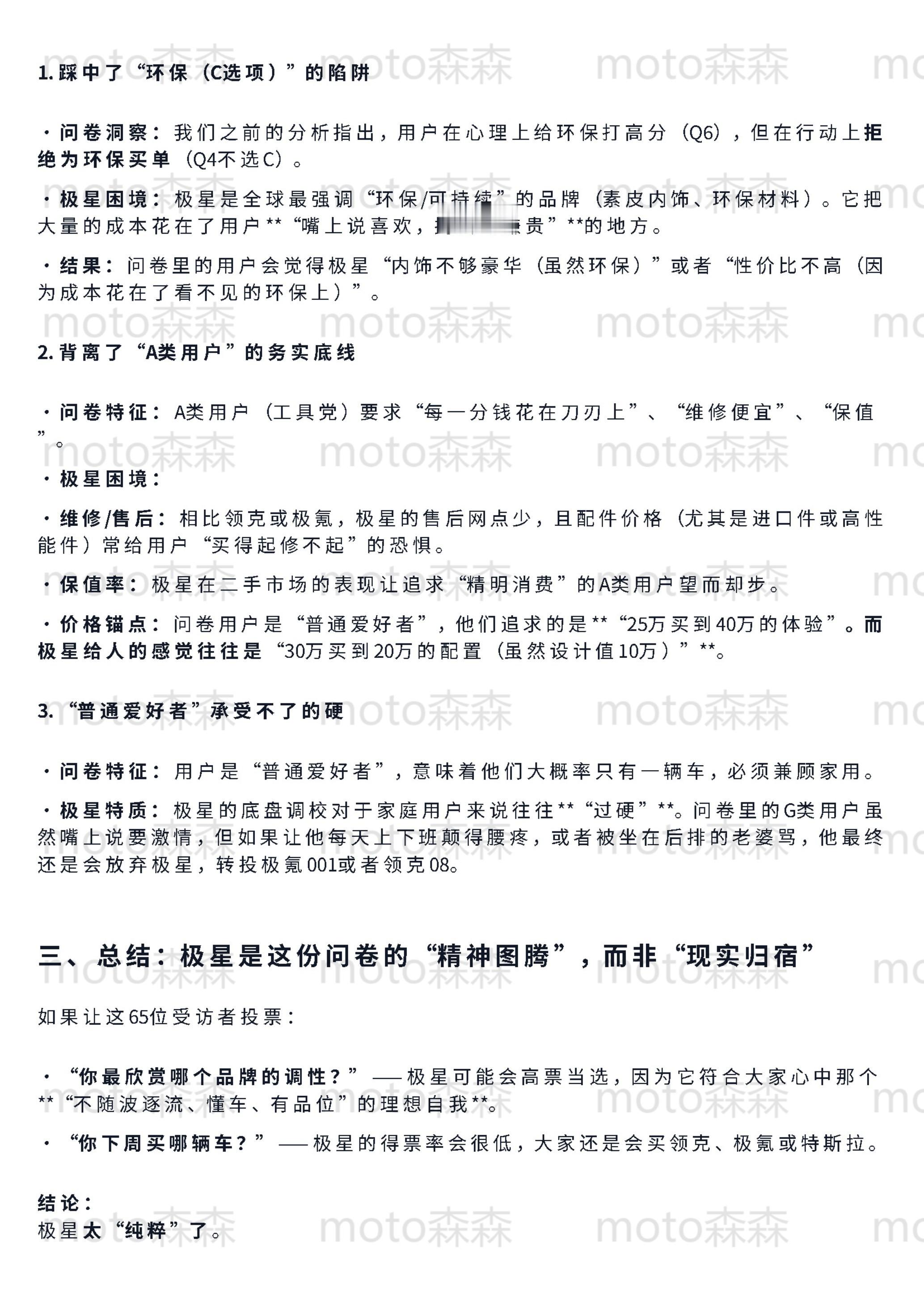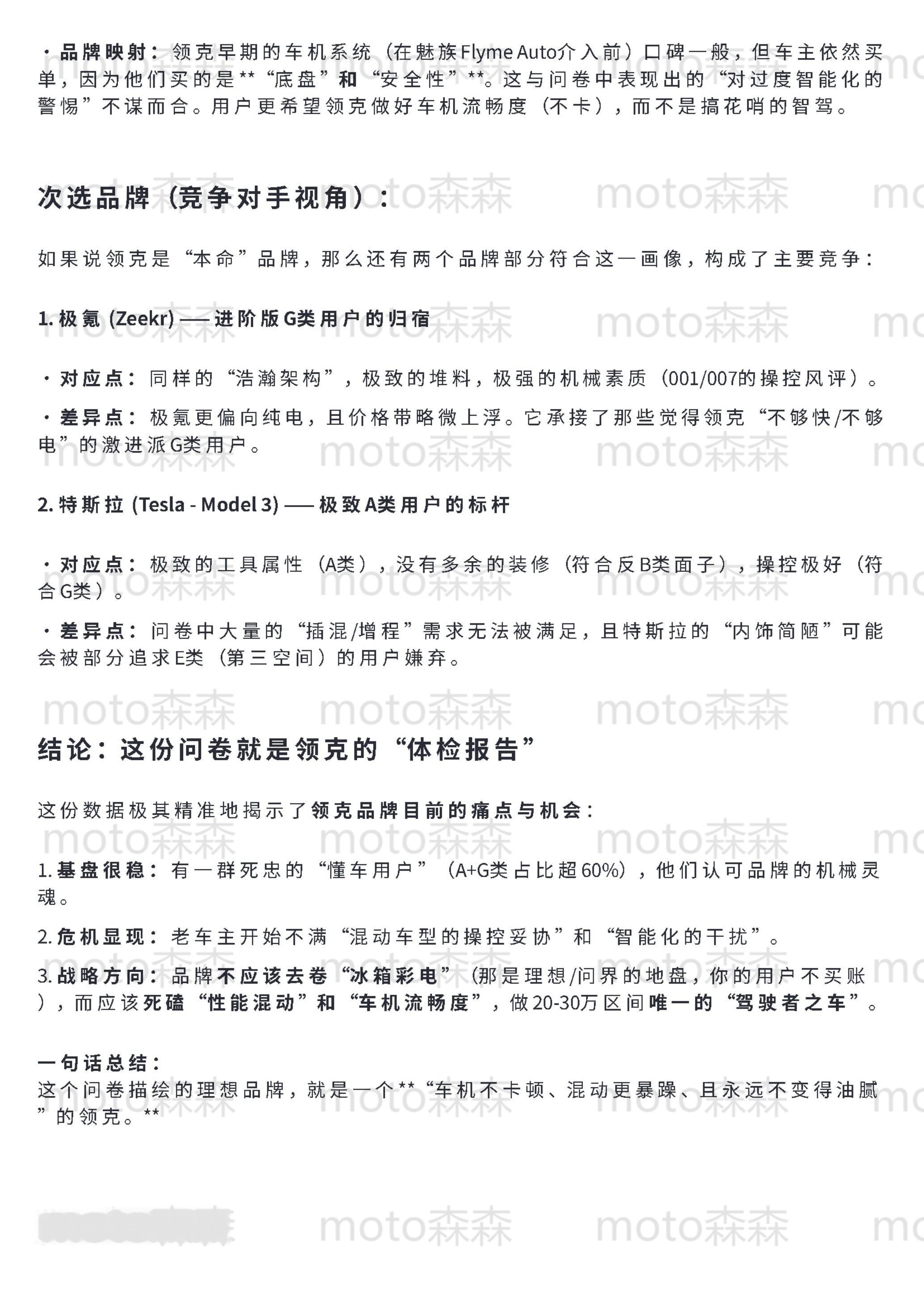 🔻梳理了65份昨天发的关于领克的问卷,发现一个明显的“返祖”现象:市场正在经历剧烈的“去魅”。🔻关于“面子”和“移动第三空间”的宏大叙事,在真正掏钱的节点上几乎全部失效。现在的核心用户极其务实,画像高度两极化:要么追求极致的“工具属性”(不出错、高效率、零焦虑),要么执着于“机械素质”(要操控、拒电子味、反感过度智能)。🔻这其实是成熟市场的理性回归——大家不再需要一台伪装成汽车的电子消费品,而是需要一台真正好开、耐造的机器。🔻具体的数据洞察和逻辑拆解,整理在下面(使用了gemini协助,反复拷打后的逻辑和措辞,还算是符合我的预期图1-5是对问卷结果的直接分析(综合了群体特征和车主与否等因素)图6-7是抛开问卷本身对结果的反问:你觉得我问的是谁?图8-10是我的私心,我想知道极星是不是更加极致的领克汽场全开大v聊车领克
