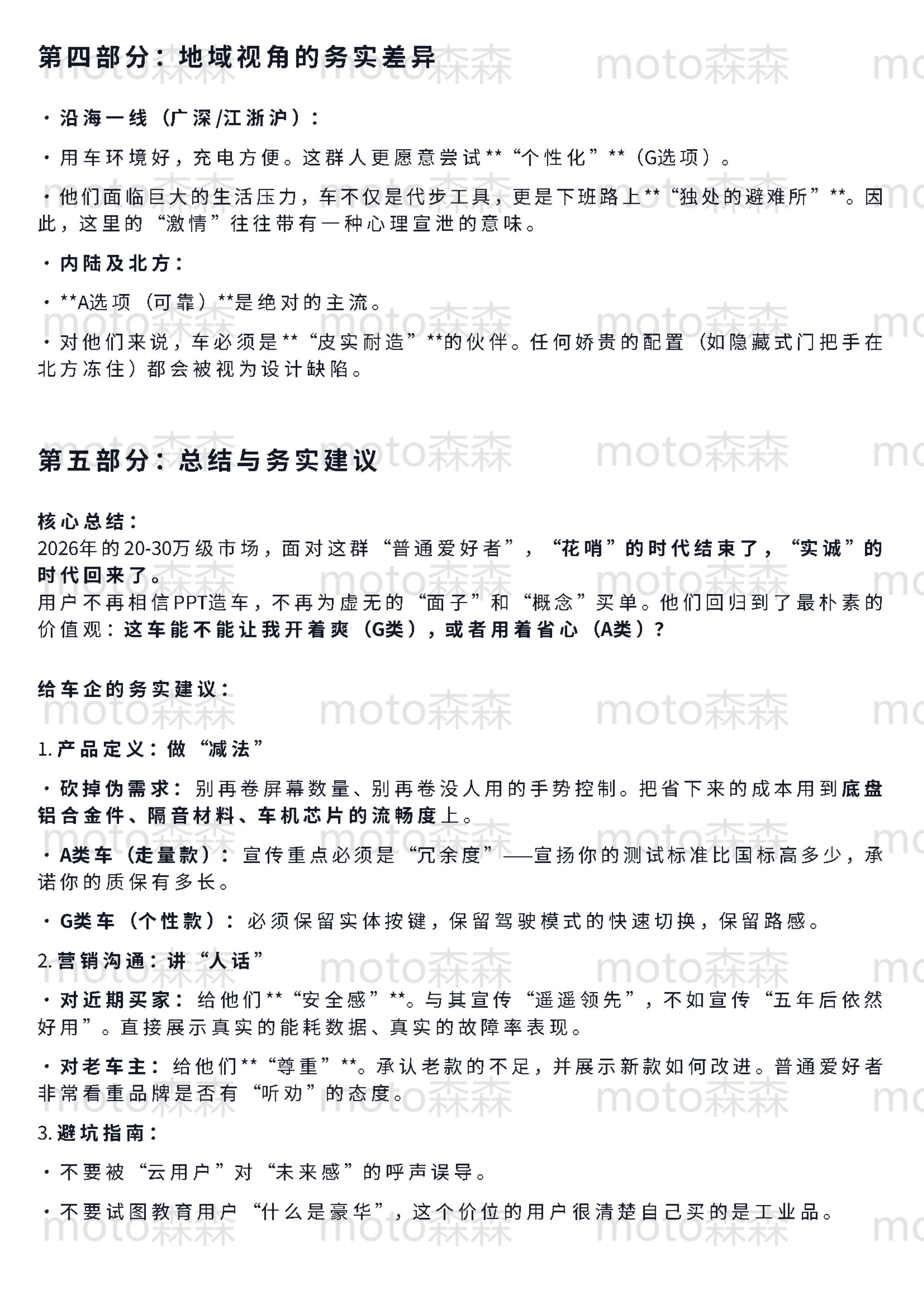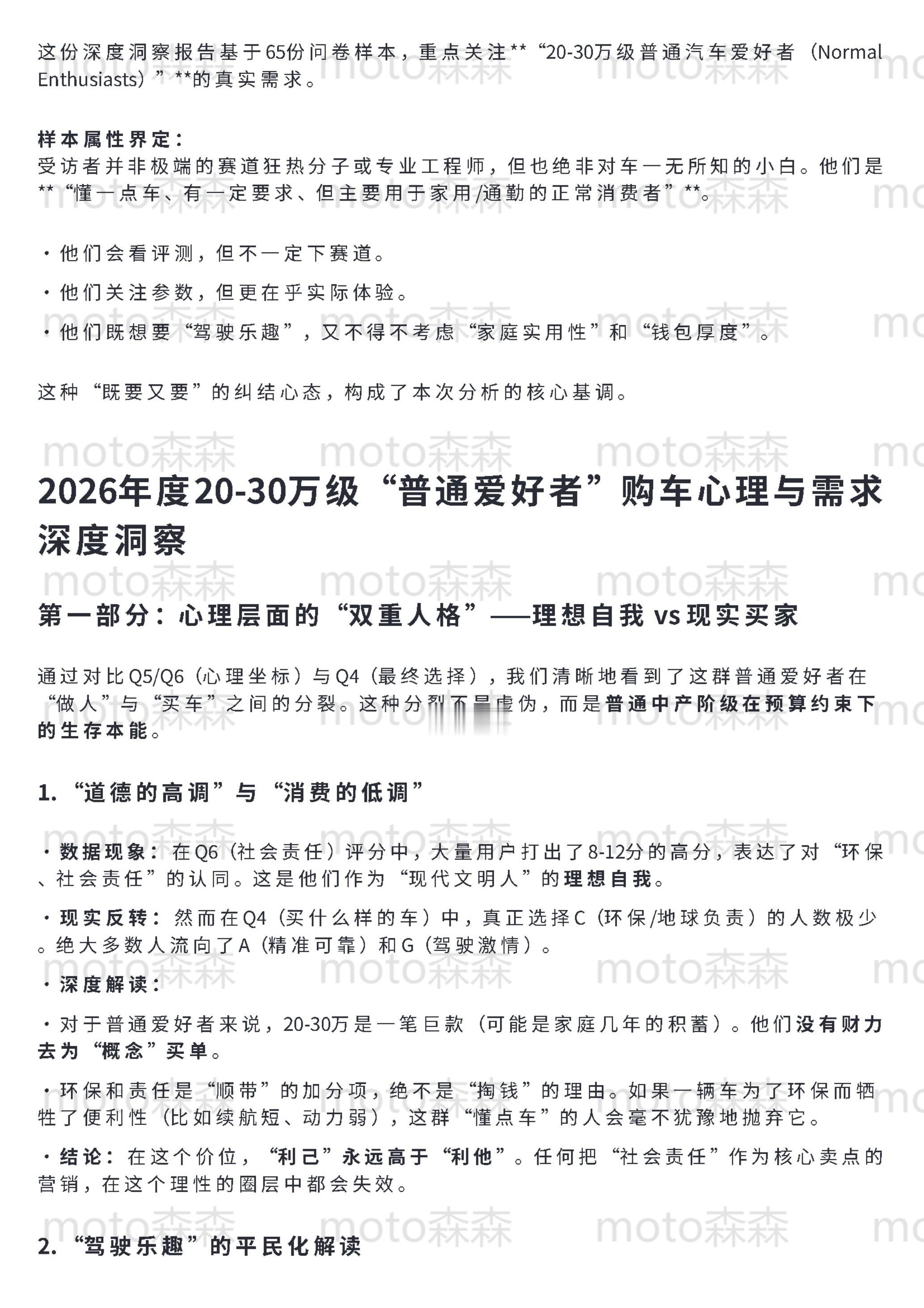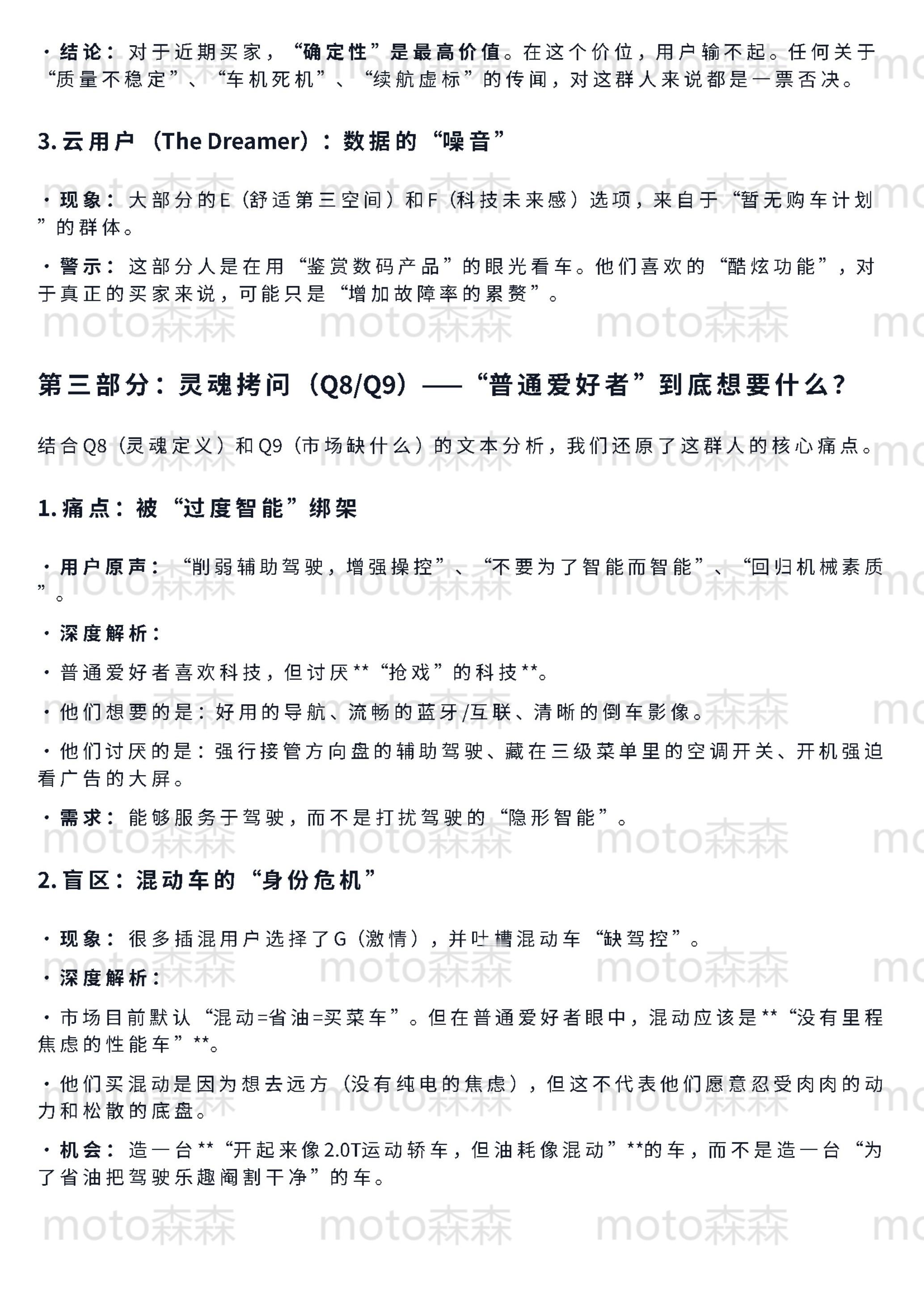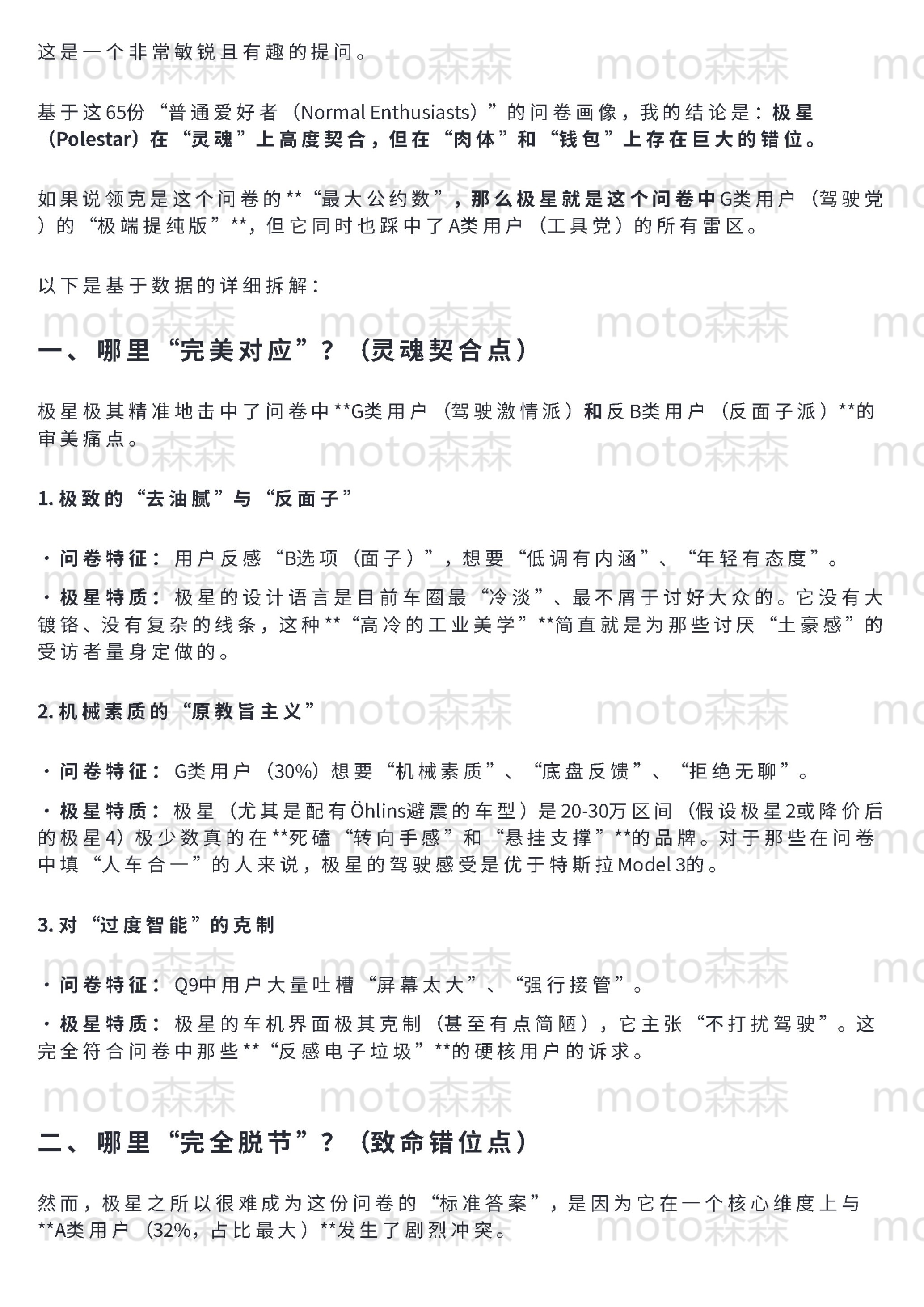 🔻梳理了65份昨天发的关于领克的问卷,发现一个明显的“返祖”现象:市场正在经历剧烈的“去魅”。🔻关于“面子”和“移动第三空间”的宏大叙事,在真正掏钱的节点上几乎全部失效。现在的核心用户极其务实,画像高度两极化:要么追求极致的“工具属性”(不出错、高效率、零焦虑),要么执着于“机械素质”(要操控、拒电子味、反感过度智能)。🔻这其实是成熟市场的理性回归——大家不再需要一台伪装成汽车的电子消费品,而是需要一台真正好开、耐造的机器。🔻具体的数据洞察和逻辑拆解,整理在下面(使用了gemini协助,反复拷打后的逻辑和措辞,还算是符合我的预期图1-5是对问卷结果的直接分析(综合了群体特征和车主与否等因素)图6-7是抛开问卷本身对结果的反问:你觉得我问的是谁?图8-10是我的私心,我想知道极星是不是更加极致的领克汽场全开大v聊车领克