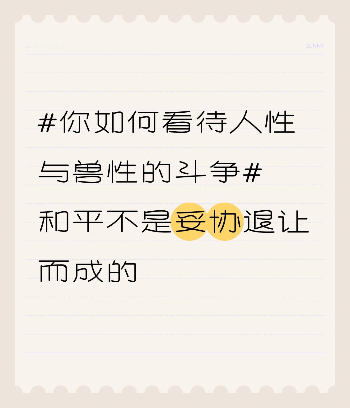 和平不是靠妥协退让得来的,这和人性与兽性的斗争息息相关。在人类社会中,人性代表着善良、理智、包容,而兽性则是贪婪、暴力、自私。当我们一味妥协退让,就如同纵容兽性肆虐。 就像历史上一些国家面对侵略者的妥协,换来的不是和平,而是更残酷的压迫。人性想要构建和平,就得拿出反抗的勇气,和兽性正面交锋。只有坚守原则,用强硬的手段回击兽性的攻击,才能让和平真正到来。所以,在这场人性与兽性的斗争中,绝不能退缩,要为和平勇敢战斗。