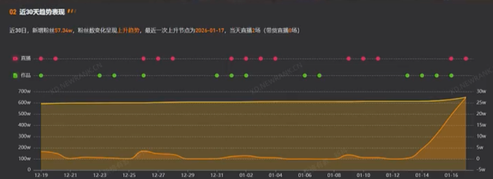 1月18日,记者搜索发现,据第三方数据平台,李亚鹏1月17日直播5个小时,销量在10万-25万,销售额在1000万-2500万元,为近30天销售额最高的直播。此外,李亚鹏近30天新增粉丝57.34万。
