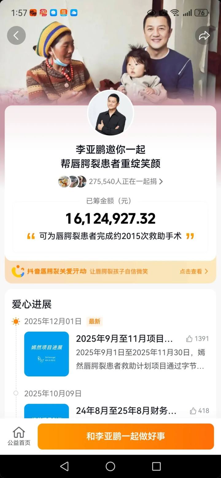 1月14日晚,李亚鹏在社交平台发布一段名为《最后的面对》采访视频,详细解答了北京嫣然天使儿童医院因拖欠2000万租金而面临迁址甚至关停的经过与感想,视频发布后爆火,大量网友涌入直播间支持李亚鹏,截至1月18日13:57,捐款数已超1600万。
