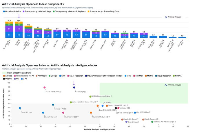 根据ArtificialAnalysis的数据,目前全球开放程度排名前三的模型分别来自NVIDIA(Nemotron3)、AllenInstitute(Olmo3)和穆罕默德·本·扎耶德人工智能大学(MBZUAI,K2-V2)。