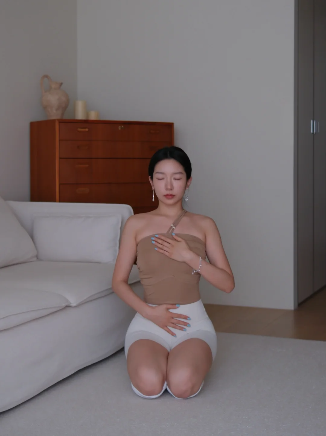 《青衫裹轻柔》瑜伽室的柔光漫开时,她立在浅暖里——薄荷绿背心裹着清透的软,