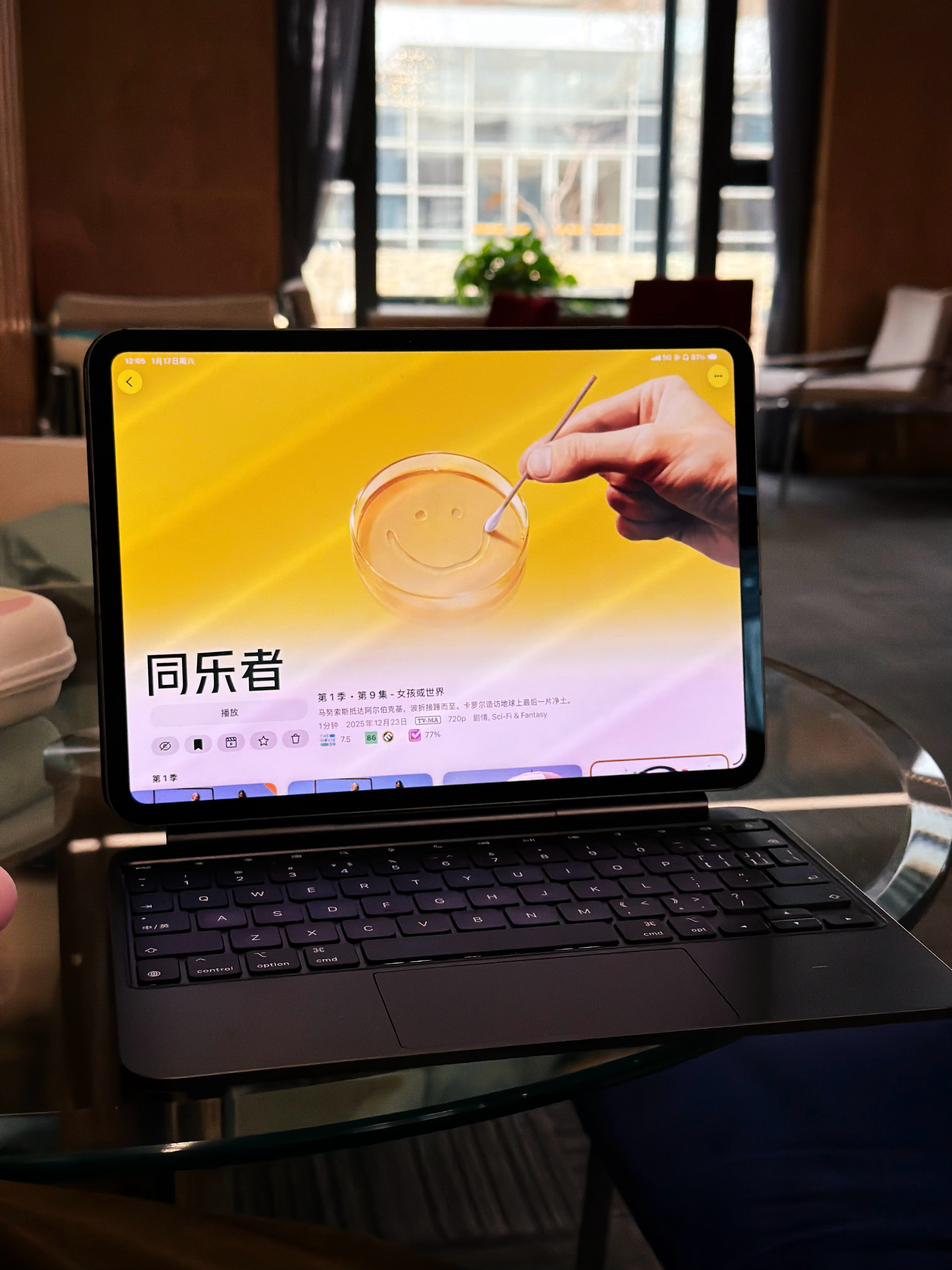 今天是陪女朋友学车的一天,她跟着教练学车,我在休息室等着她我现在用 iPad Pro 看同乐者这个 HDR 的片子,还有纳米纹理玻璃不反光,效果太好了。每次用的时候都很震撼