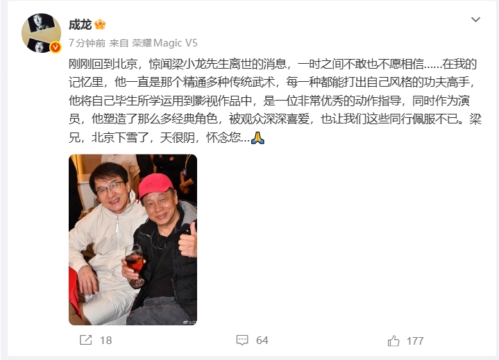 “刚刚回到北京,惊闻梁小龙先生离世的消息,一时之间不敢也不愿相信……在我的记忆里,他一直是那个精通多种传统武术,每一种都能打出自己风格的功夫高手,他将自己毕生所学运用到影视作品中,是一位非常优秀的动作指导,同时作为演员,他塑造了那么多经典角色,被观众深深喜爱,也让我们这些同行佩服不已。梁兄,北京下雪了,天很阴,怀念您…”