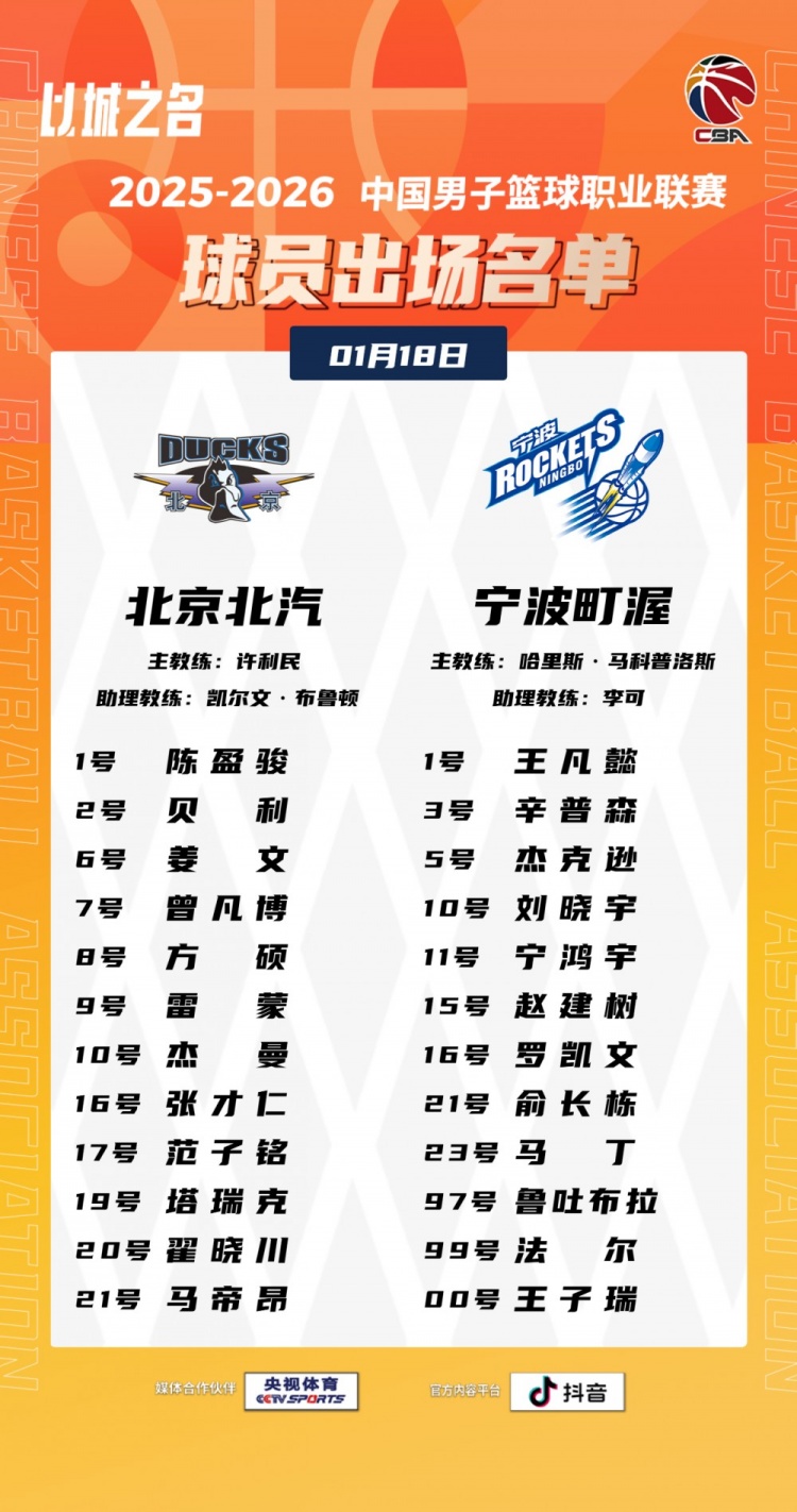 直播吧1月18日讯19:35北京将在主场迎战宁波,赛前大名单出炉。