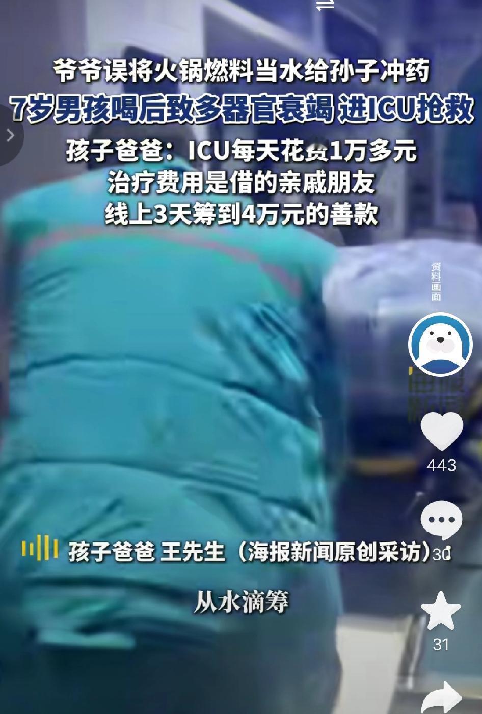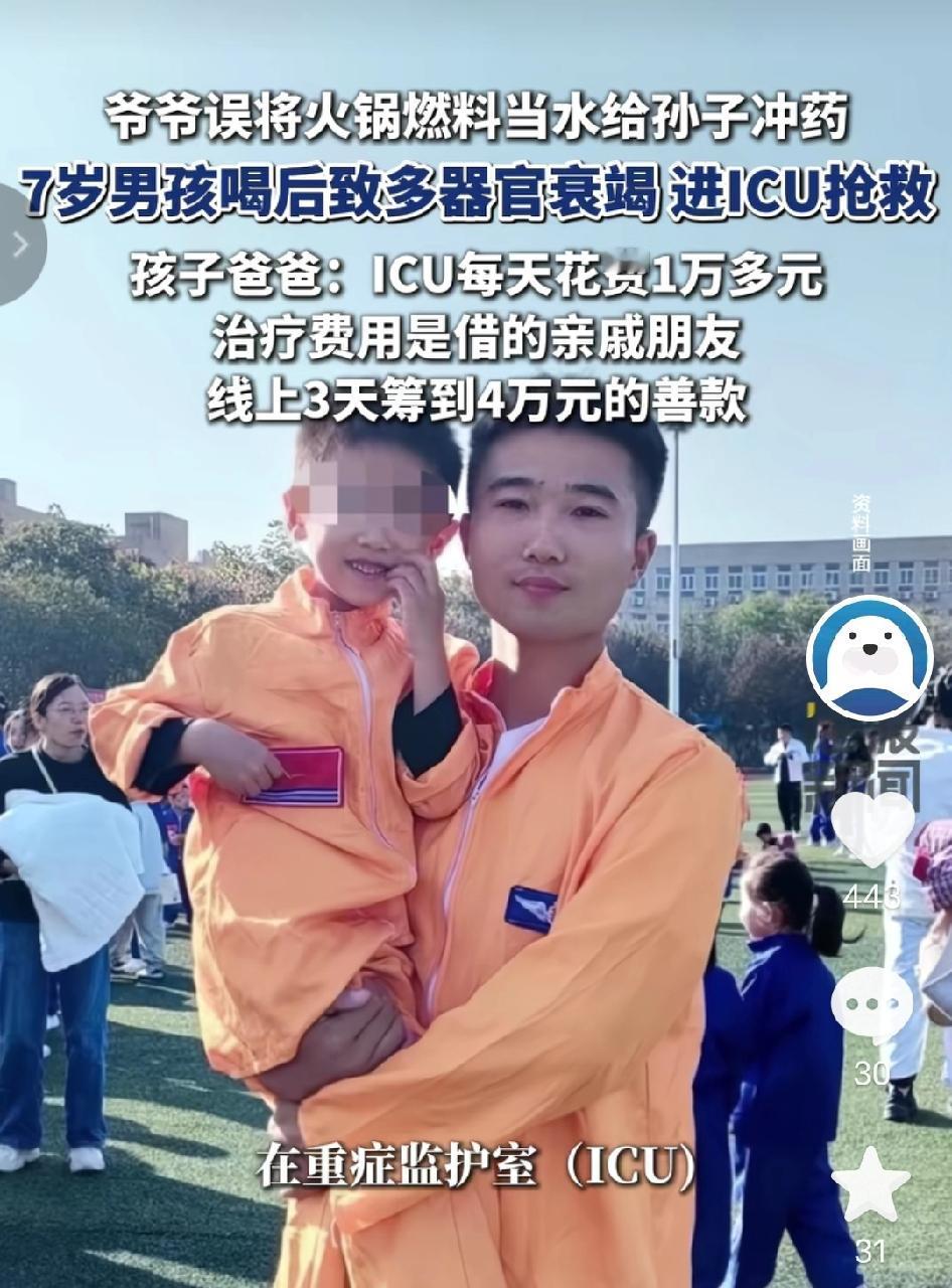 痛心!河南郑州,7岁男童感冒发烧,爷爷误把瓶装火锅燃料当饮用水冲药,孩子喝下后很快呕吐腹痛,确诊多器官衰竭紧急进ICU,父亲崩溃:心都碎了,治疗费压得全家喘不过气!   1月的河南郑州,天气还透着寒意,7岁的轩轩突然感冒发烧,精神蔫蔫的喊着难受。爷爷心疼孙子,想着赶紧冲包感冒药让孩子喝了好受点,转身就去拿了一旁看着像矿泉水瓶的透明瓶子,倒出里面的液体冲了药,没多想就让轩轩喝了下去。孩子喝下药后,还天真地问爷爷“为什么这个药味道怪怪的! 谁也没想到,这瓶“饮用水”,竟装的是家里吃火锅用的燃料!瓶子没贴任何警示标签,外观和矿泉水瓶几乎一模一样,爷爷年纪大眼神不好,压根没分辨出来。 轩轩喝下“药水”没多久,就开始剧烈呕吐、捂着肚子喊疼,脸色瞬间惨白,没一会儿就浑身无力瘫在地上。家人这才察觉不对,吓得赶紧抱起孩子往医院跑,一路上不停喊着轩轩的名字,手心全是冷汗。 送到医院后,检查结果让全家如遭雷击:轩轩是急性甲醇中毒,燃料的甲醇已侵入身体,引发多器官衰竭,必须立刻转入ICU抢救!医生说,甲醇进入人体会代谢成甲酸,不仅损伤肝肾,还可能致失明,轩轩情况危急,能不能挺过来全看这几天。 从住院到现在,轩轩一直在ICU里,家人连探视都难,每天治疗费就超1万元,目前已经花了近6万元,全是亲友凑的。轩轩爸妈本是工地务工人员,得知消息后立马辞职守在医院,父亲王先生蹲在ICU外,红着眼眶说:“当时知道是火锅燃料,我心都碎了,孩子才7岁,不管花多少钱,我都要救他!” 可普通打工家庭根本扛不住ICU的开销,后续治疗费缺口还有十几万,家人只能发起筹款,3天筹得4万元,可距离所需费用还差一大截,看着手机里的筹款进度,夫妻俩整夜整夜睡不着。 更让人揪心的是,这种用饮料瓶装危险物品的习惯,在农村非常普遍,仅去年县里就发生过5起误食悲剧,每一起都让人心碎。大家总觉得“懒得贴标签、单独放”,却不知这小小的疏忽,可能酿成无法挽回的悲剧。 - “太揪心了!火锅燃料怎么能装矿泉水瓶,还不贴标签,老人孩子很容易认错啊!” - “看着孩子遭罪太心疼,希望轩轩能挺过来,也希望大家都引以为戒!” - “农村好多家庭都这样,危险物品随便装,真该好好宣传,别再出这种事了!” - “愿孩子早日脱离危险,帮帮这家人吧,打工家庭哪扛得住这么贵的治疗费!” 一瓶没贴标签的火锅燃料,差点毁了一个孩子一个家!危险物品装饮料瓶、不做警示,真的太致命了。 你家的危险物品都是单独存放、贴好标签的吗? 7岁男童误饮火锅燃料进ICU 爷爷误把燃料当水冲药 甲醇中毒多器官衰竭 揪心民生 安全警示 争议民生 农村安全  来源:海报新闻