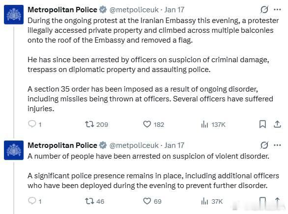伦敦警方报告称,伊朗驻伦敦大使馆遭到巴列维暴徒围攻期间,4名伦敦警察在保卫伊朗使馆安全时受伤并被送往医院。伊朗局势哈梅内伊说特朗普造成伊朗人员伤亡