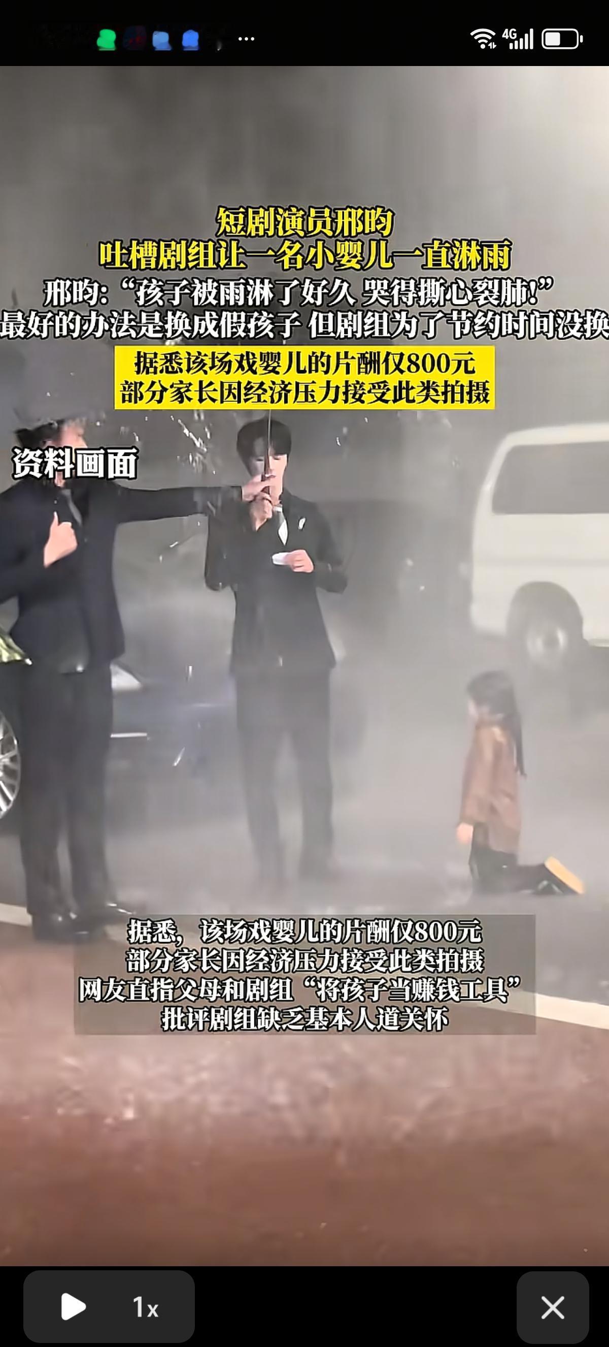 短剧演员吐槽剧组一直让婴儿淋雨,孩子哭的撕心裂肺。邢女士发文称某剧组夜里12点拍雨戏,一直让孩子淋雨,洒水车那种瓢泼大雨,她透露因为要拍近景,她和对手女演员脸上不能有雨,所以伞不能放低,最好的解决办法是拍她们的时候把孩子换成假孩子,但是剧组为了节约时间就没有换。 孩子妈妈在一旁脸色很难看,但没有阻止。邢女士还透露让孩子拍摄一天的费用是800元。邢女士表示希望短剧少一点儿童剧情,太心疼了。 孩子妈妈有没有可能阻止不了,比如担心赔违约金啥的?
