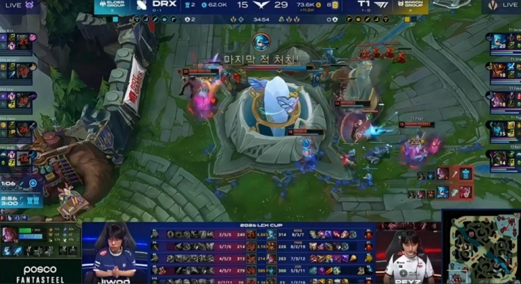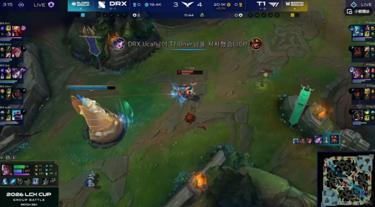 24分钟UCAL辛德拉TP落地想守塔,直接吃到Oner皇子盖大白给!T1拆掉中二塔之后扩大经济差到5K!27分钟DRX四人越塔强杀Doran格温未果,T1支援赶到分割战场,打出1换4之后顺势拿下二大龙+听牌龙!经济优势来到接近8K!