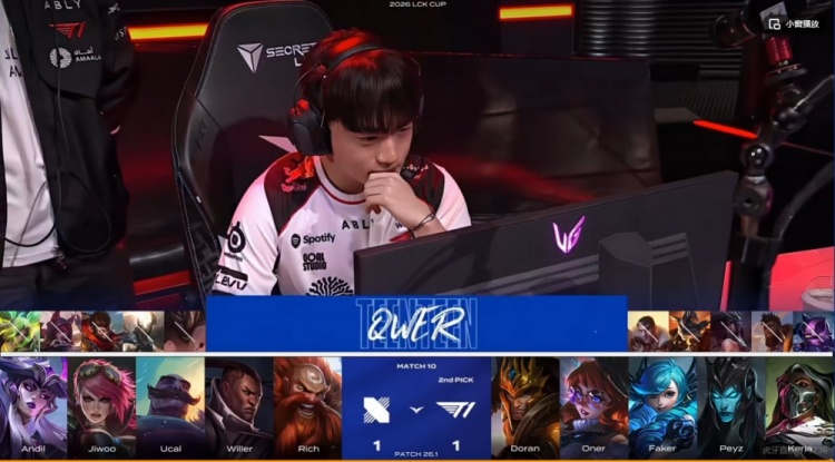 T1:上单Doran、打野Oner、中单Faker、下路Peyz、辅助Keria
