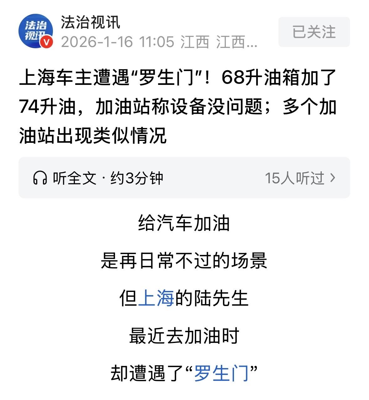 “不可思议!”上海,男子开着SUV去加油,他估摸油箱里还剩15到20升油,谁料,车竟被加注73.5升汽油,男子傻眼,他的车油箱容量只有68升,怎么装得下88升左右的油?男子觉得当中一定有猫腻,工作人员却坚称设备没问题,认为可能是车辆油箱的实际容量大于标称值。 一个68升的容器,装下88升的液体,这不是魔术表演,而是上海车主陆先生亲身经历的消费纠纷。 这场颠覆物理常识的遭遇,始于一次再平常不过的加油站停靠。 那天陆先生驾驶SUV驶入闵行区三鲁公路的一家中石化加油站,仪表盘油表灯没亮,续航里程显示还有150公里。 按他多年的用车经验估算,油箱里至少还剩15到20升底油,就算加满,理论上也只需要加注50升左右。 加油枪自动跳停的瞬间,陆先生习惯性扫了一眼加油机屏幕,就是这个动作,让他瞬间愣在原地。 73.5升,这个数字像一记闷棍,打得他半天没回过神,简单换算一下,底油加上新加注的油量,他的油箱里竟然“塞”了88升油,远超官方标注的68升容量。 陆先生拿着加油小票找到工作人员,提出了自己的质疑。 然而对方的回应却轻描淡写,既没有核对设备,也没有调取数据,只是一口咬定机器没问题,话里话外还暗示,可能是车辆的实际油箱容量比厂家标注的数值要大。 这样的说辞,陆先生只觉得荒谬,他开这款车三年多,每次加油从没超过65升,所谓的“实际容量更大”,根本站不住脚。 更让他心惊的是,和邻居闲聊时偶然提起这件事,对方竟一拍大腿,说自己不久前也在这家加油站遇到一模一样的情况,加油量同样远超自家车的油箱标称容量。 两起高度相似的事件,让“巧合”的可能性彻底被排除。陆先生决定不再沉默,他联系媒体曝光此事,希望能撕开这起消费乱象的口子。 记者介入调查后,一组来自12345市民服务热线的数据,揭开了更令人不安的真相。 近两个月内,上海多个行政区的同品牌加油站,都收到过车主关于“加油量远超油箱容量”的投诉。 这些投诉的内容几乎如出一辙,而处理结果却惊人地相似,加油站以“设备合格”为由搪塞,投诉最终石沉大海,没有任何实质性的调查结论。 为了彻底推翻“油箱容量超标”的说法,陆先生拨通了汽车厂家的客服电话,客服给出的答复,直接给加油站的辩解画上了句号。 这款SUV的油箱安全容积就是68升,按照行业标准,油箱会预留10%到15%的安全余量,用于应对汽油热胀冷缩。 但就算把余量算到极致,最大容量也不过78.2升,和88升的数值相比,差着近10升的鸿沟。 这份权威回复,让陆先生的维权底气更足,事件发酵后,闵行区市场监管局与浦江市场监管所的执法人员迅速到场检查。 初步检查结果显示,涉事加油机铅封完好,处于强制检定有效期内,误差也符合国家标准,但这个结果,依然无法解释那个违背物理常识的88升总油量。 目前,监管部门已委托第三方计量质量检测站开展专业检测,同时联动汽车厂家核查油箱真实容量。这场双向核验,成了揭开真相的关键。 从法律层面来看,《计量法》早已明确,使用计量器具不得破坏其准确度,损害消费者利益。 而加油机作为强制检定设备,最大允许误差仅为±0.3%,这样的误差范围,根本无法造成20升的巨大偏差。 有业内人士指出,部分加油站可能会通过软件层面的隐蔽操作作弊,这种手段很难通过常规检查发现,唯有专业检测才能揪出猫腻。 这起事件,给所有车主敲响了警钟,遇到加油量异常的情况,一定要当场提出异议,要求查看加油机检定标志,申请现场量筒复核,同时留存好加油小票等证据。 若加油站拒不配合,直接拨打12315投诉,用法律武器保护自己,陆先生的维权之路还在继续,那个68升油箱装下88升油的谜题,亟待一个明确的答案。 这件事看似只是一起小小的加油纠纷,实则触碰了市场公平的底线,小小加油机,关乎的不仅是几十块油钱,更是市场公平与消费者信任。 期待第三方检测结果早日出炉,让真相水落石出,也让类似的消费乱象,彻底失去滋生的土壤。 信息来源:南国今报2026-01-15发布:68升油箱加出73.5升!上海车主懵了:我油箱里还剩15升油呢?