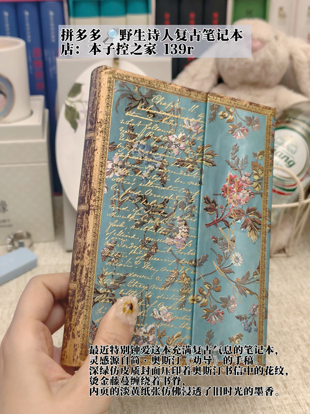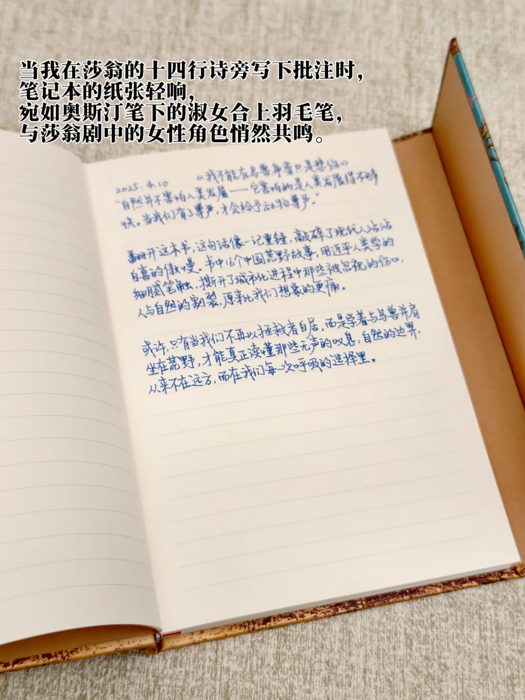 最近特别钟爱这本充满复古气息的笔记本,灵感源自简·奥斯汀《劝导》的手稿。深绿仿皮质封面压印着奥斯汀书信中的花纹,烫金藤蔓缠绕着书脊,内页的淡黄纸张仿佛浸透了旧时光的墨香。当我在莎翁的十四行诗旁写下批注时,笔记本的纸张轻响,宛如奥斯汀笔下的淑女合上羽毛笔,与莎翁剧中的女性角色悄然共鸣。