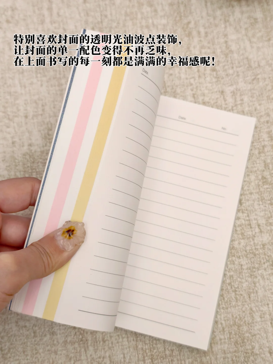 饱和度拉满的封面,内里是白色横纹结构与四种彩色空白内页相间隔,这本笔记本将颜值与实用度结合得恰到好处。特别喜欢封面的透明光油波点装饰,让封面的单一配色变得不再乏味,在上面书写的每一刻都是满满的幸福感呢!