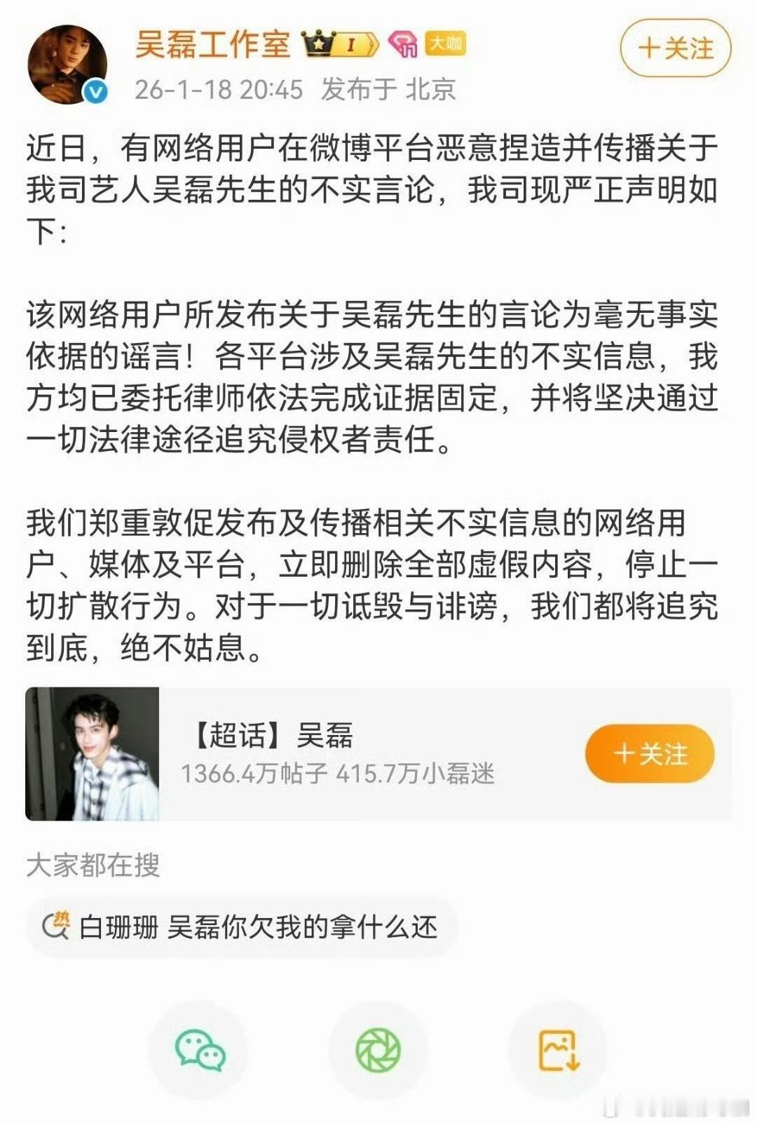 吴磊工作室已经光速回应驳斥谣言,强调将通过法律途径追责!所以白珊珊口中的吴磊是哪个吴磊……白珊珊爆料和吴磊恋情这个吴磊说的是哪个吴磊