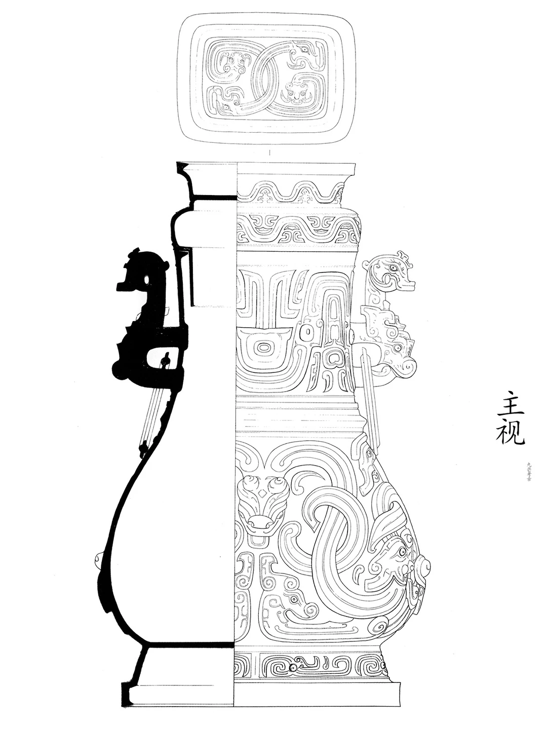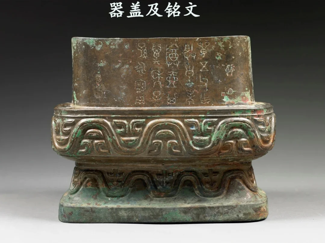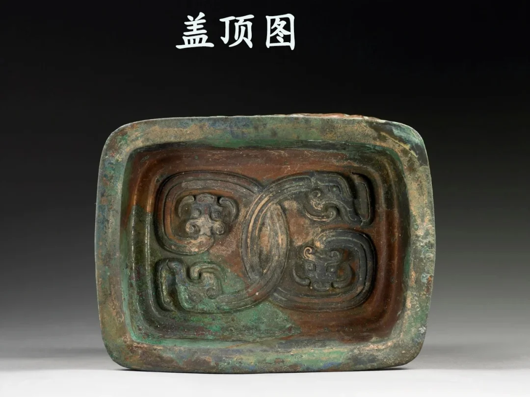 器形:横截面呈圆角长方形,口小腹大,直口,口沿内侧加厚起棱内勾,长直颈,颈两侧有兽首半环耳,套接扁圆环。颈腹之间分界明显,垂鼓腹,圜底近平,矮圈足下折起台。圜顶盖,盖口向下略内收,子口,顶近平,长方形圈足状大捉手。