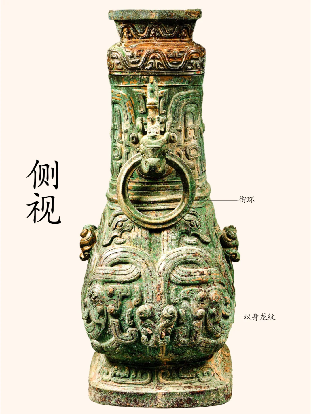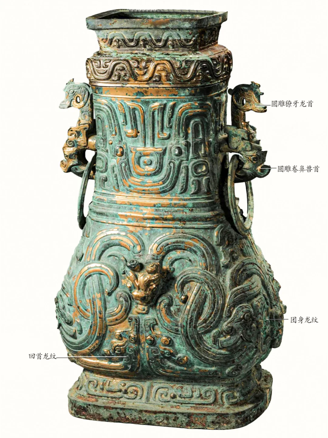 器物名称:双身团龙纹壶(博物馆展牌名称:单五父方壶 )。