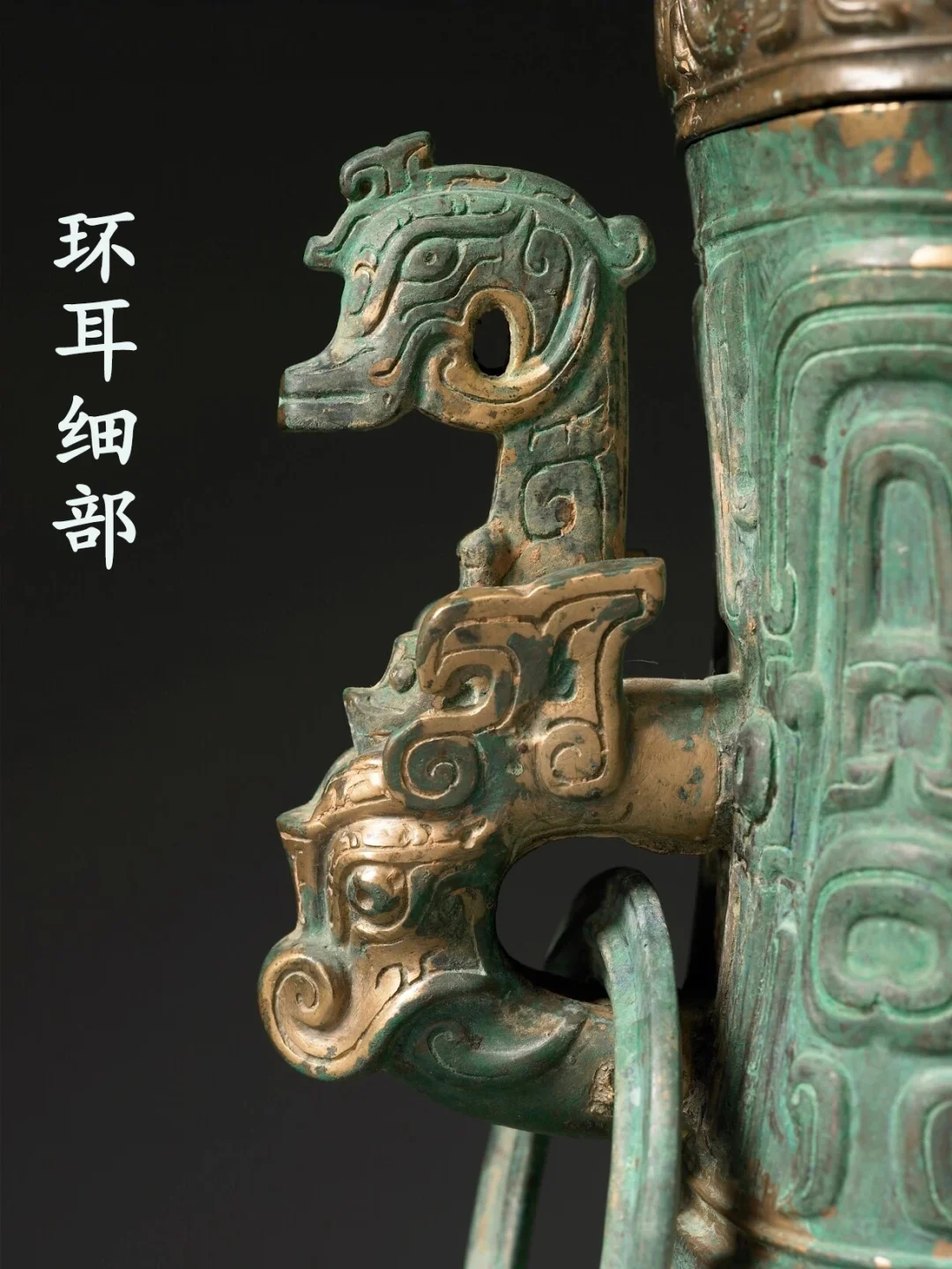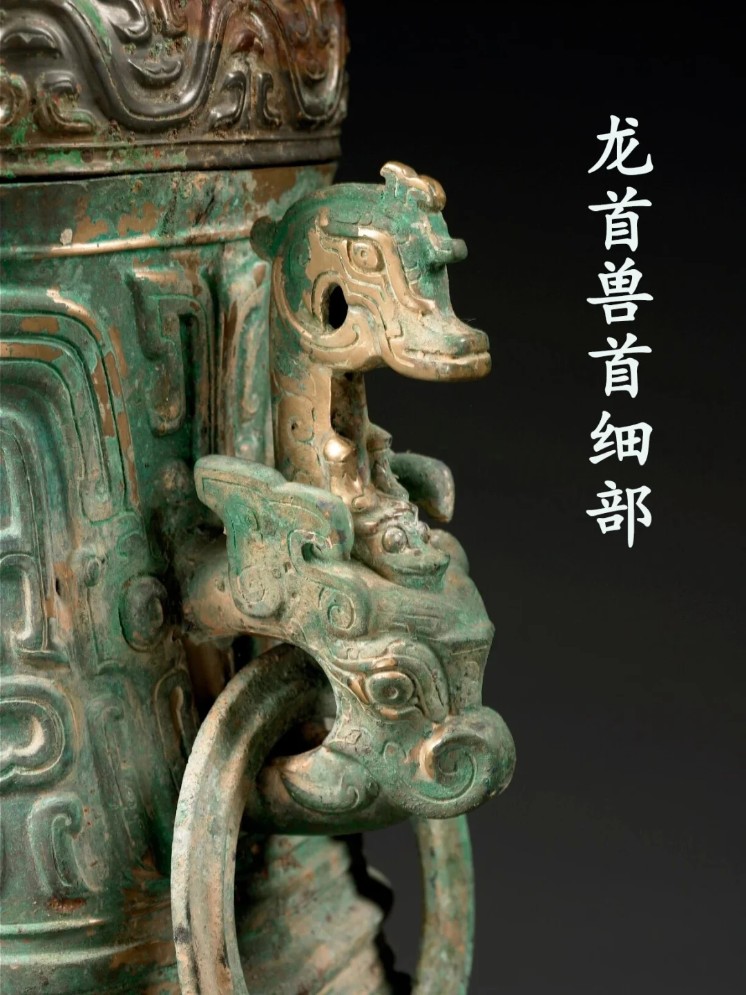 纹饰:通体主纹均为高浮雕。盖捉手一周饰小环带纹,盖面一周饰中环带纹,颈部饰一周大环带纹,环带纹由简至繁。颈部大环带纹,结构复杂,中间有目纹,配以阴线。环带纹当为龙纹的变体,其间填以阴线、云纹、羽纹等。环带纹在三星堆器物中较为流行。颈腹之间有一条宽凸棱,上面由两周阴线纹和一周箍纹组成。腹部饰浮雕团龙纹,腹正背面和左右两侧面正中各有一高浮雕龙首。龙首为一首双身,身躯左右分岐,呈波浪状,并与几条龙纹相交。圈足外壁饰一周四组夔纹,每一组中心有扉脊,夔首相向,对称分布。