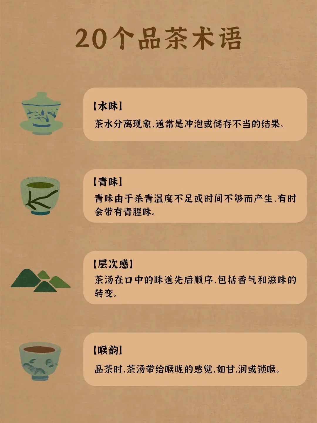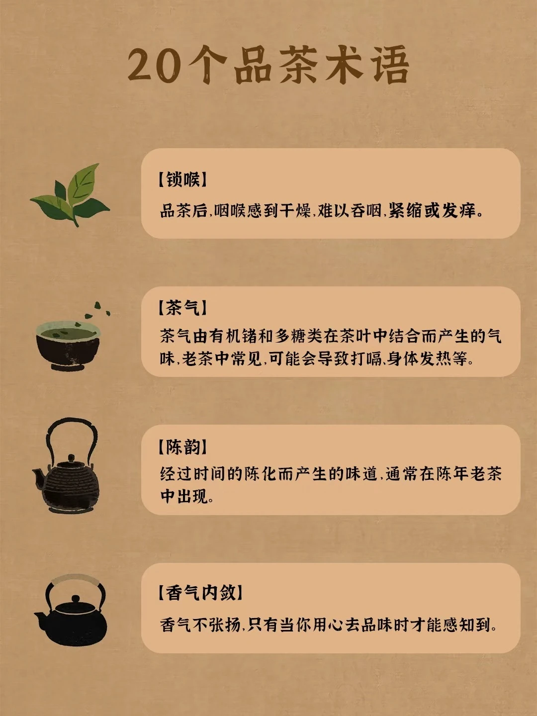 喉韵:品茶时,茶汤带给喉咙的感觉,如甘、润或锁喉。