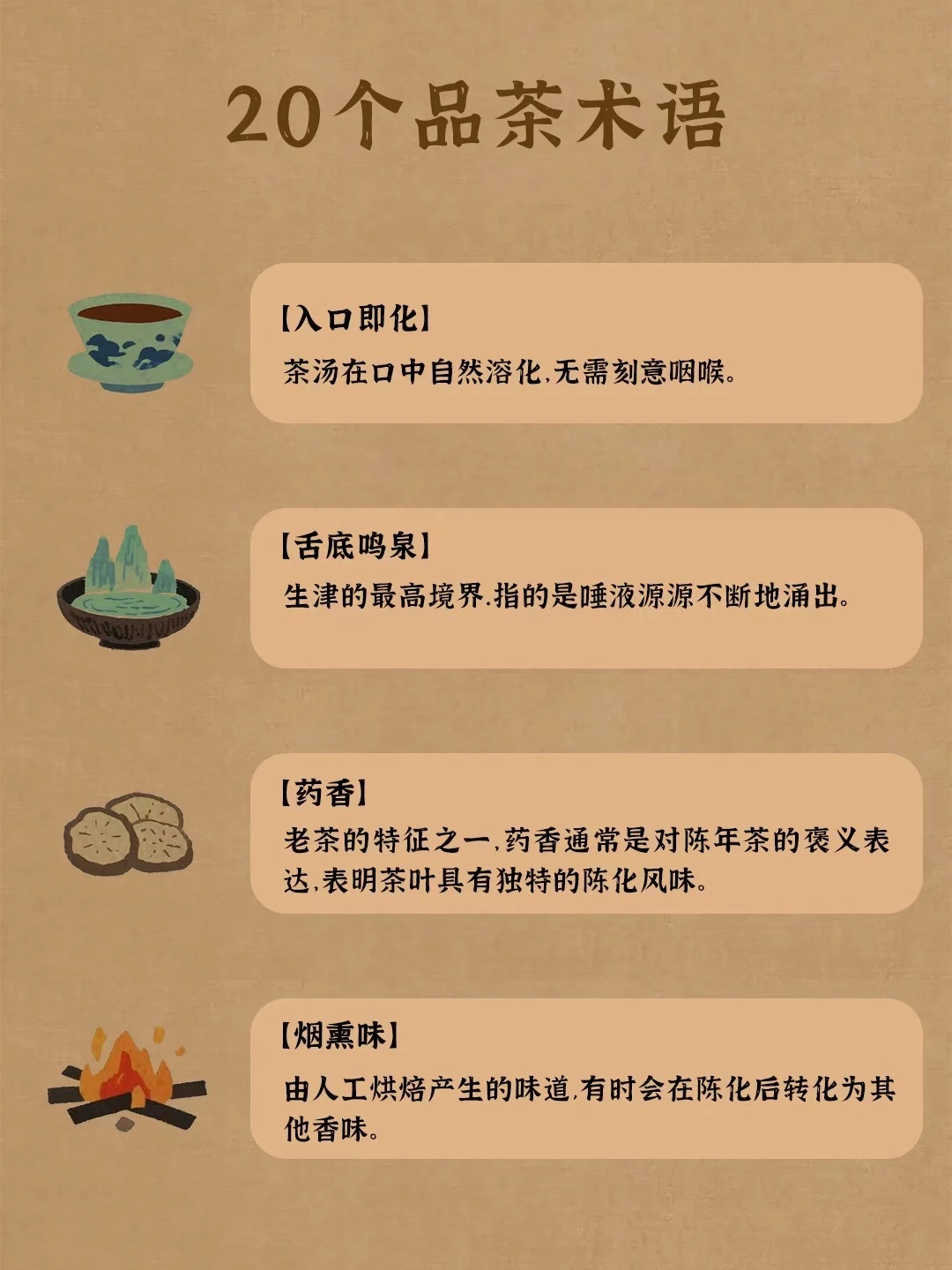 陈韵:经过时间的陈化而产生的味道,通常在陈年老茶中出现。