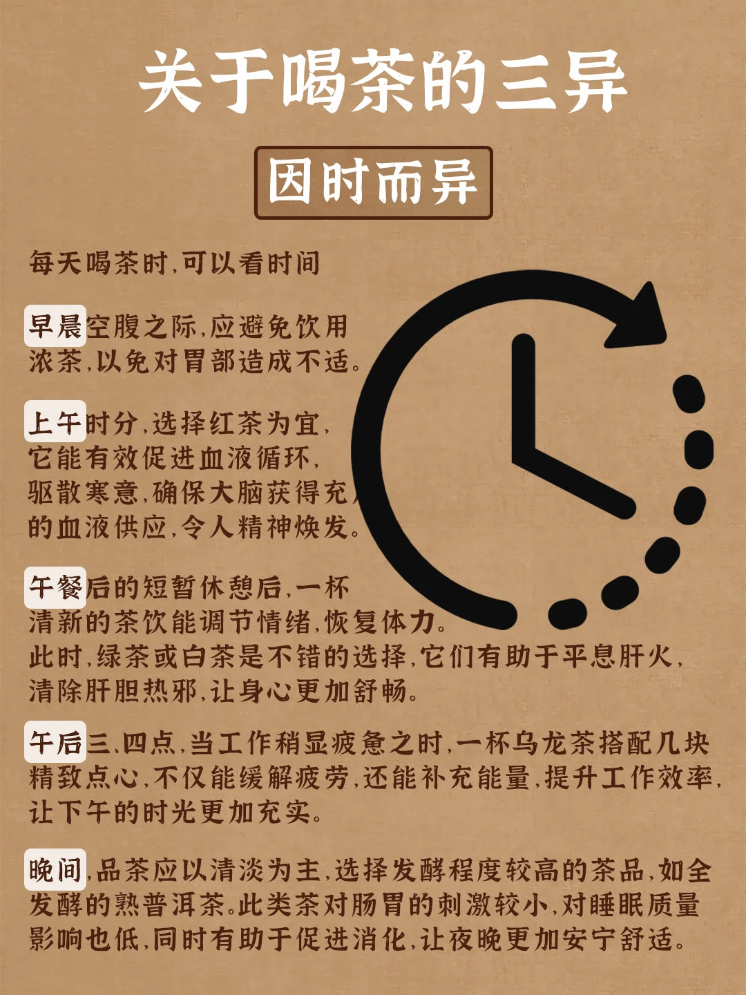 1️⃣喝茶,要因人而异 🌟什么体质喝什么性质的茶 2️⃣喝茶,要因时而异 👉喝茶要看季节。👉看时间。👉看身体状态的即时变化。 3️⃣喝茶,要因场合而异 🔥不同场合喝不同的茶,用适当的茶具
