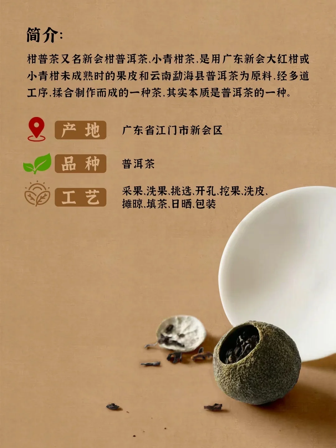 🔍 什么是小青柑? 小青柑 = 新会青柑 + 云南熟普,柑橘清香撞上醇厚茶汤,一口上头! 核心产地:广东新会(柑皮)+ 云南勐海(熟普),强强联合! 特点:柑香清新解腻,熟普温和养胃,适合办公室懒人党~ 🌟 为什么推荐小青柑? 刮油神器:聚餐后泡一杯,肠胃瞬间轻松! 提神不伤胃:熟普发酵温和,咖啡因含量低。 高颜值耐泡:一颗泡一整天,越喝越甜润~