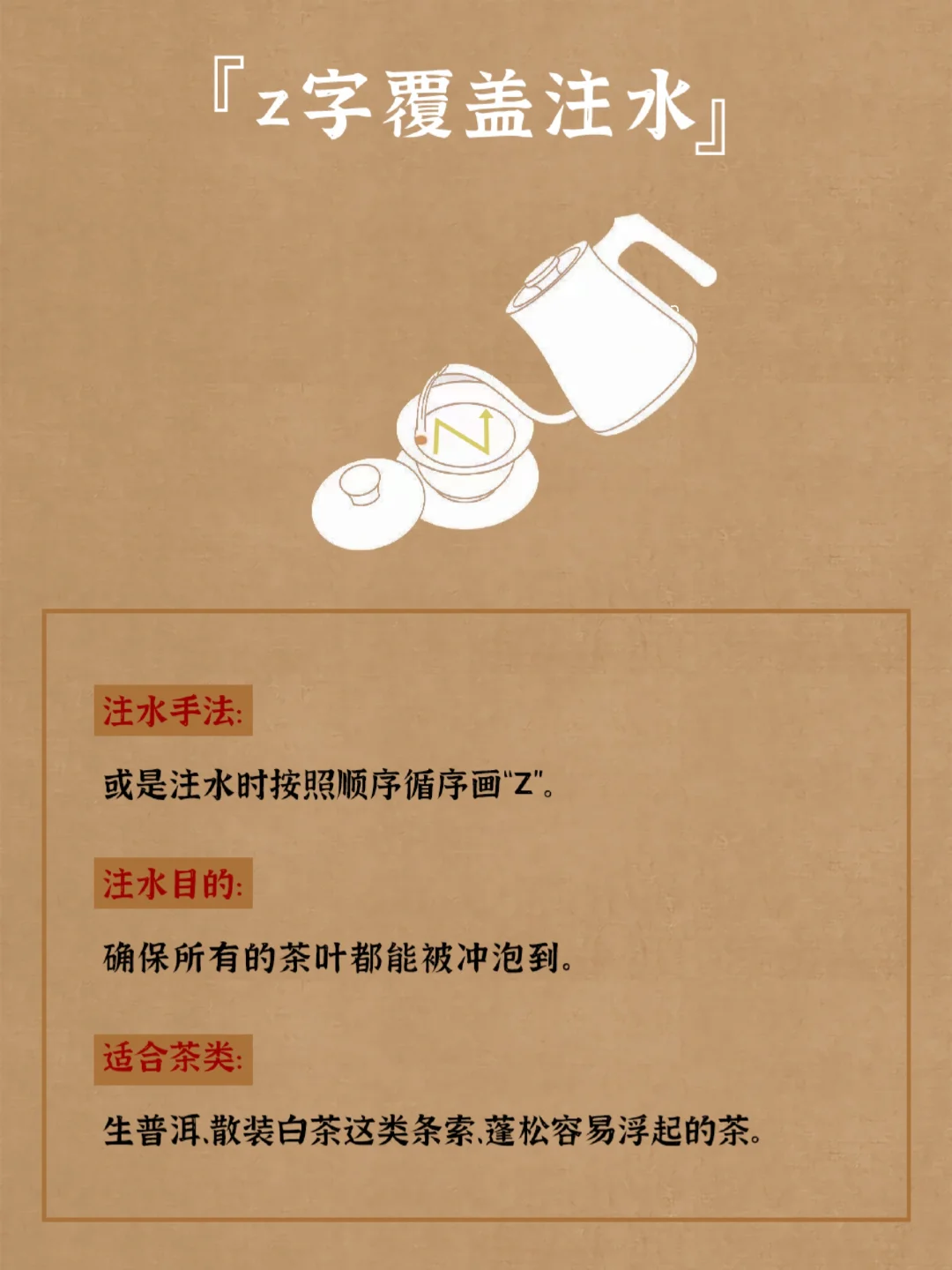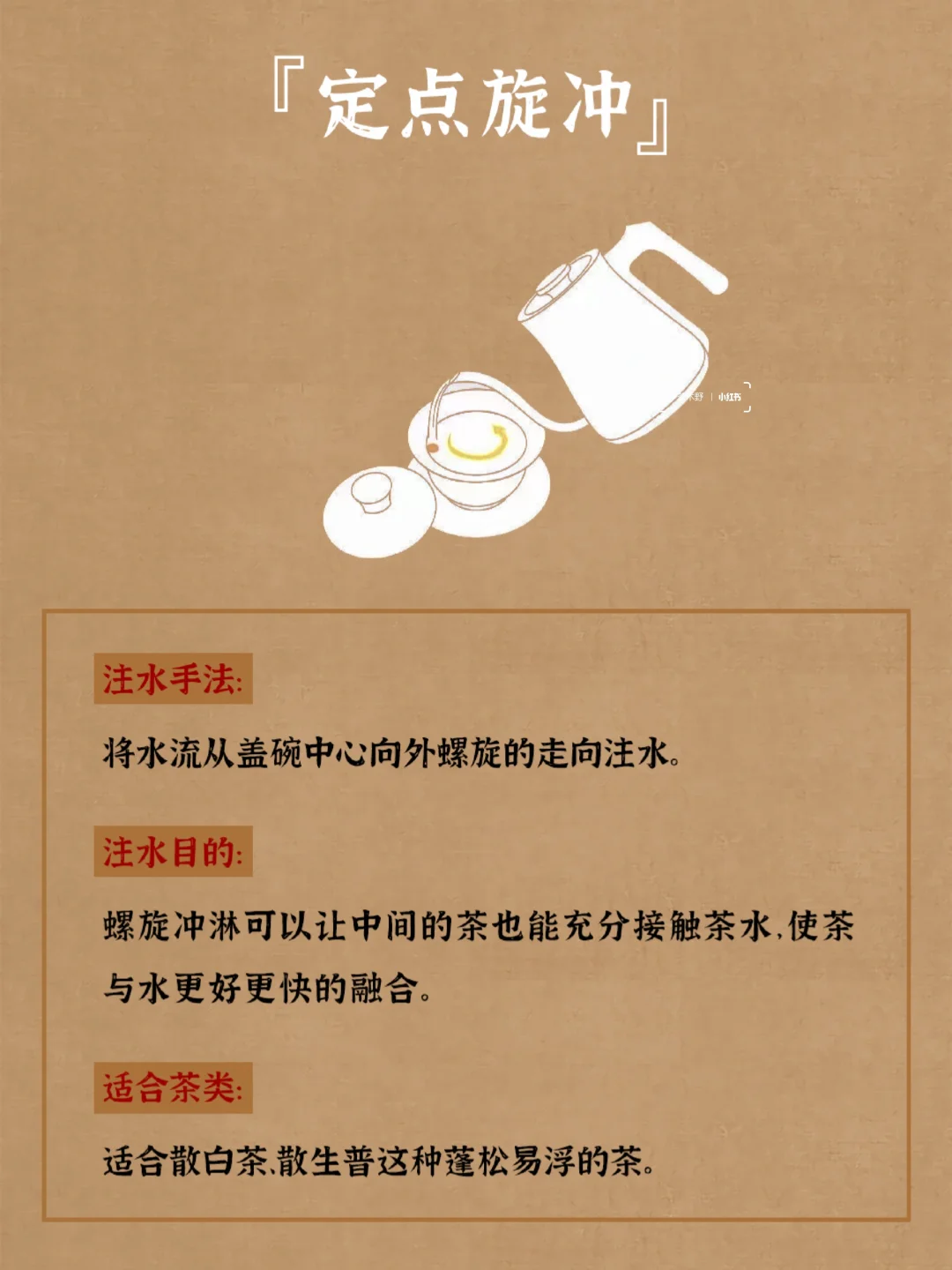 泡茶总被烫成红手指?这6种注水手法让你优雅掌控茶汤浓淡!🍵 💦 6大核心手法拆解 1.悬壶高冲 悬高水壶之后进行注水,注水点在盖碗的边沿处。 2..Z字覆盖注水 注水时按照顺序循序画“Z” 3.环圈注水 注水时沿盖碗的边缘旋转一圈,收水时正好回到原点。 4.定点旋冲 将水流从盖碗中心向外螺旋的走向注水。 5.定点低冲 将注水点固定在盖碗边缘的一个地方,壶嘴紧挨盖碗口沿缓缓地注水。 6.正中定点注水 通常搭配较细的水流缓缓注入。 收藏🌟 下次茶友聚会露一手