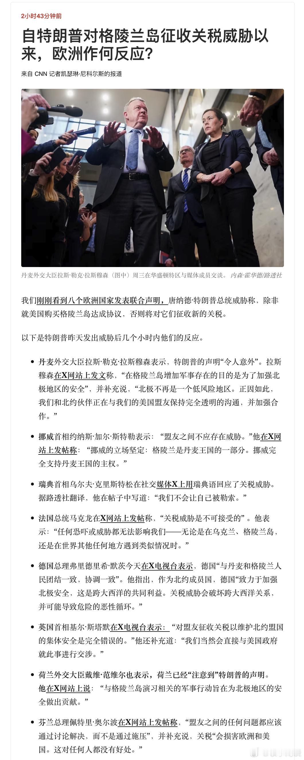 【贝森特说,“欧洲人会明白”,最好的结果是美国控制格陵兰岛】(CNN)财政部长斯科特·贝森特表示,欧洲将"理解"美国提议接管格陵兰岛的决定,此举旨在防范中俄在北极地区扩大影响力。贝森特今日在NBC《与媒体见面》节目中称:"我相信欧洲人会理解,美国维持或获得对格陵兰岛的控制权才是最佳结果。"贝森特将格陵兰岛描述为国家安全的"关键所在",同时强调了建造"黄金穹顶"——即特朗普政府提出的雄心勃勃的导弹防御系统——的重要性。他还指出,特朗普总统"目光已超越明年,着眼于北极可能爆发的战事……美国必须掌控此地"。"让(格陵兰)成为美国领土。这不会引发冲突,因为当前美国是全球最炙手可热的国家,也是最强大的国家。欧洲人展现的是软弱,而美国展现的是力量。"贝森特如是说。周六,特朗普宣布对丹麦、芬兰、法国、德国、荷兰、挪威、瑞典和英国八个欧洲国家加征10%关税,直至"达成全面收购格陵兰岛的协议"。当被问及格陵兰岛与北约哪个对国家安全更重要时,贝森特回应:"欧洲领导人终将转变立场,他们会意识到必须置身于美国的安全保护伞之下。"